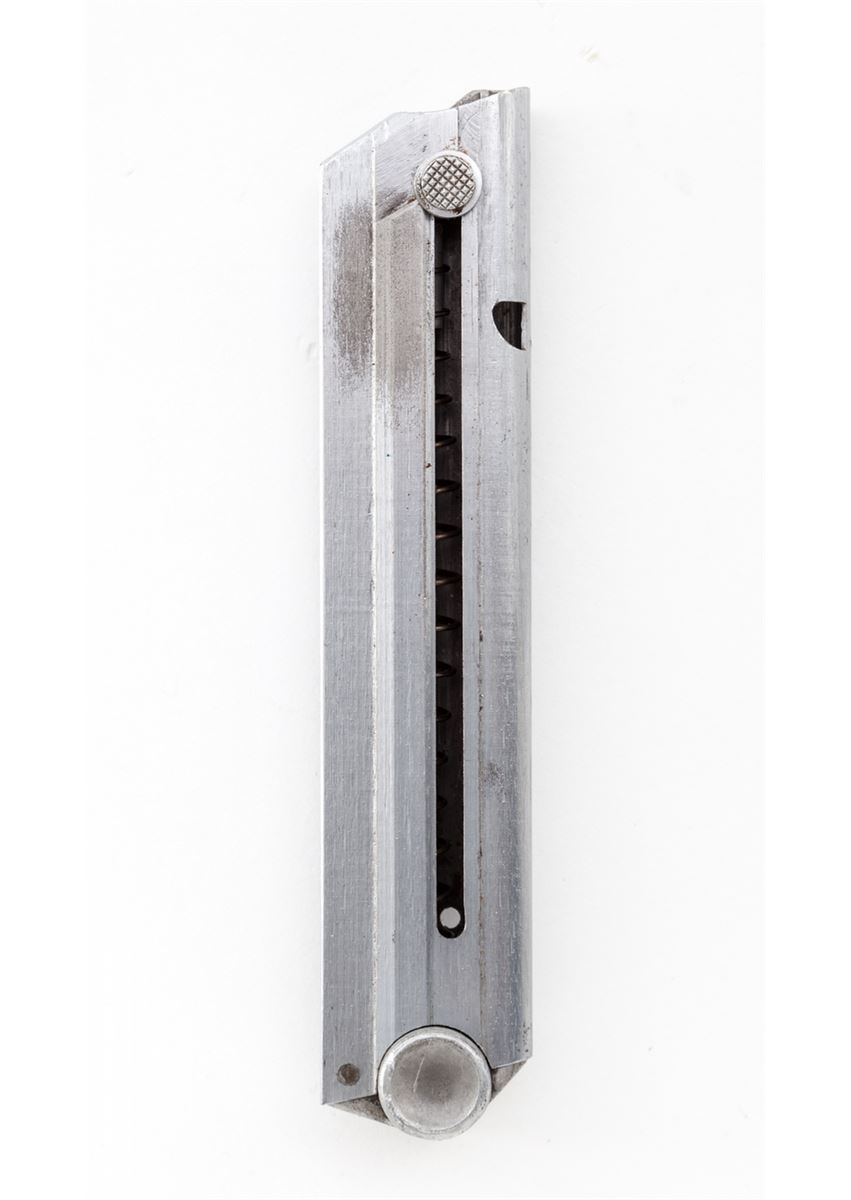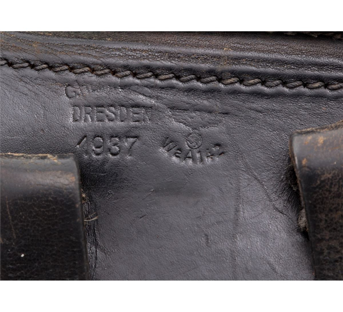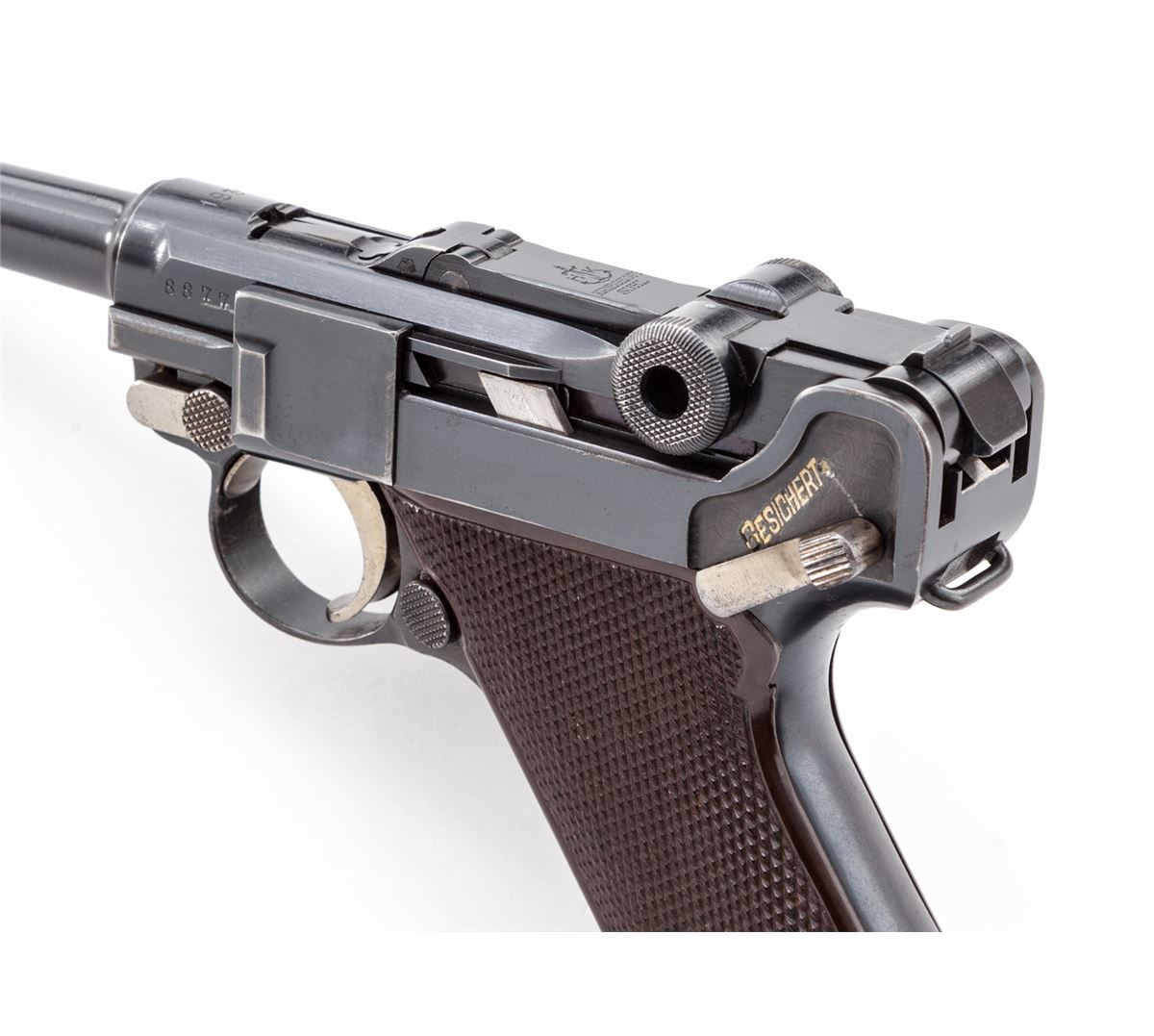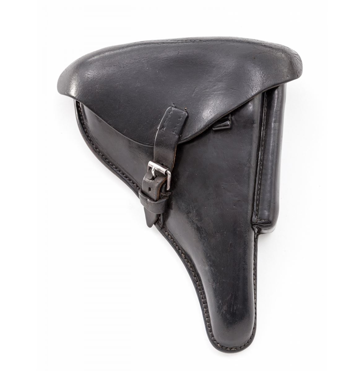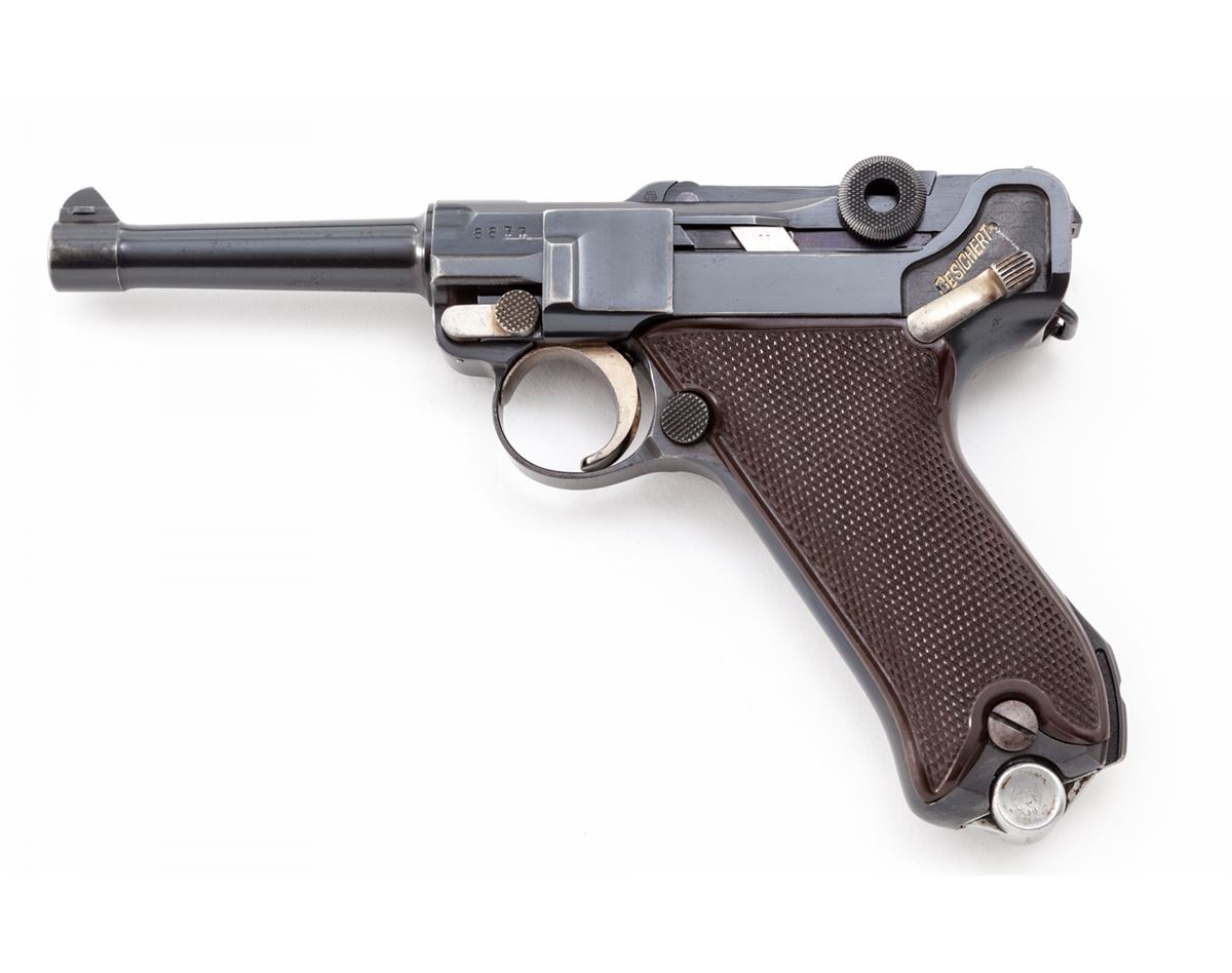 1937 dated Krieghoff Luger, #8877, 9mm, 4'' barrel, salt blue finish with straw small parts, brown checkered molded grips with smooth border, and two (2) bright extruded magazines with matching numbered aluminum bases, with one 1937 dated holster. Chamber area dated 1937, Krieghoff logo to central toggle link; frame, upper receiver and barrel with Luftwaffe inspection marks. Considered somewhat scarce with approx. 3000 mfg'd in 1937. Condition is excellent retaining approx. 97% original blue with wear at muzzle and high edges of sideplate, thinning to front and backstrap. Grips and action are crisp, bore is bright. One magazine may be force matched as its numbers are of a different height than the other. Holster shows evidence of applied polish, with light impressions and tight stitching. Est.: $5,000-$7,500. (C&R/PPT) (John Siroonian estate)