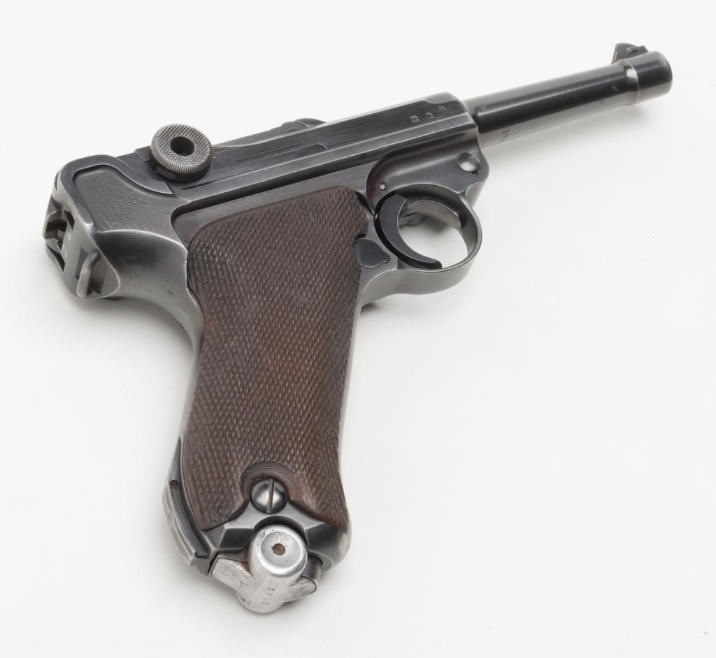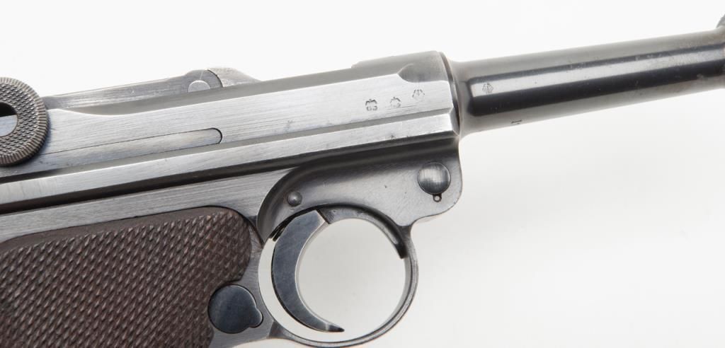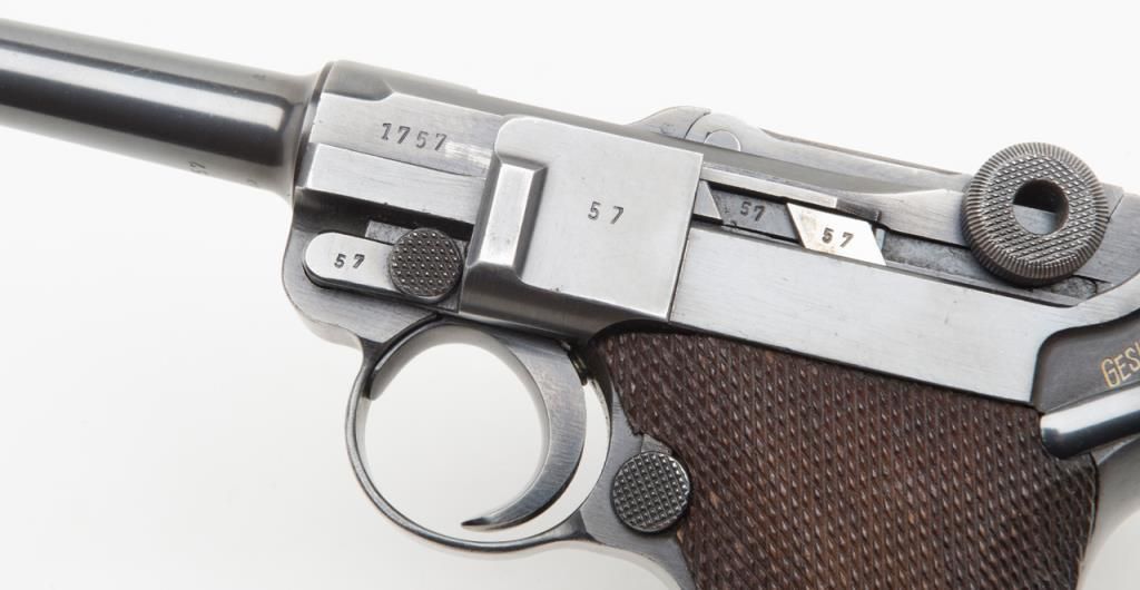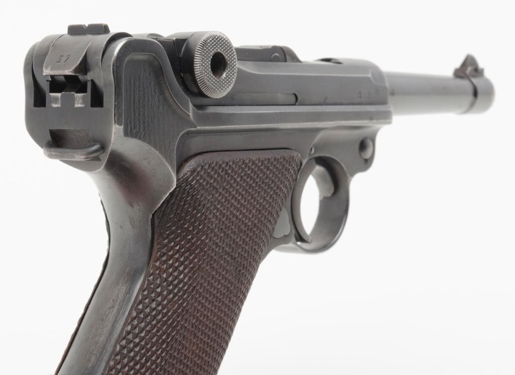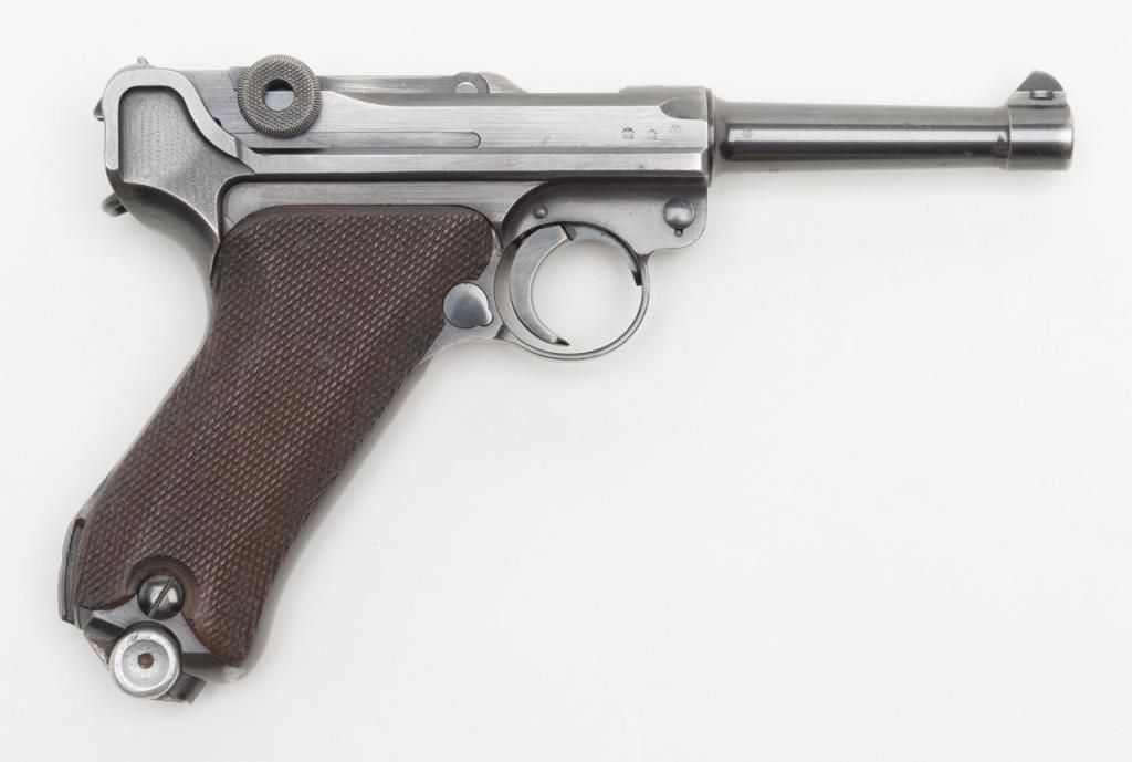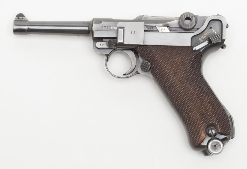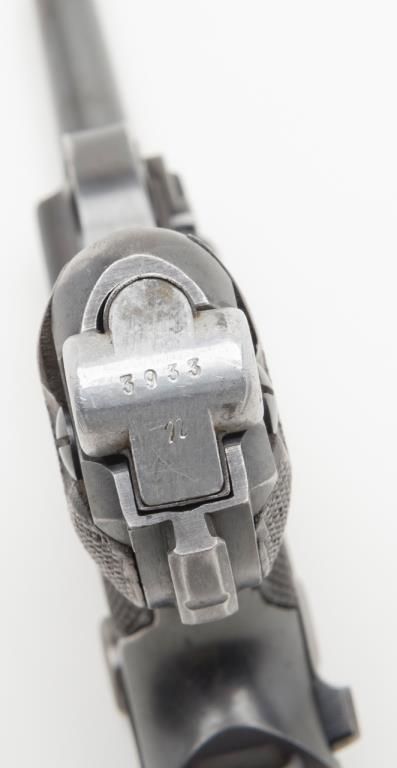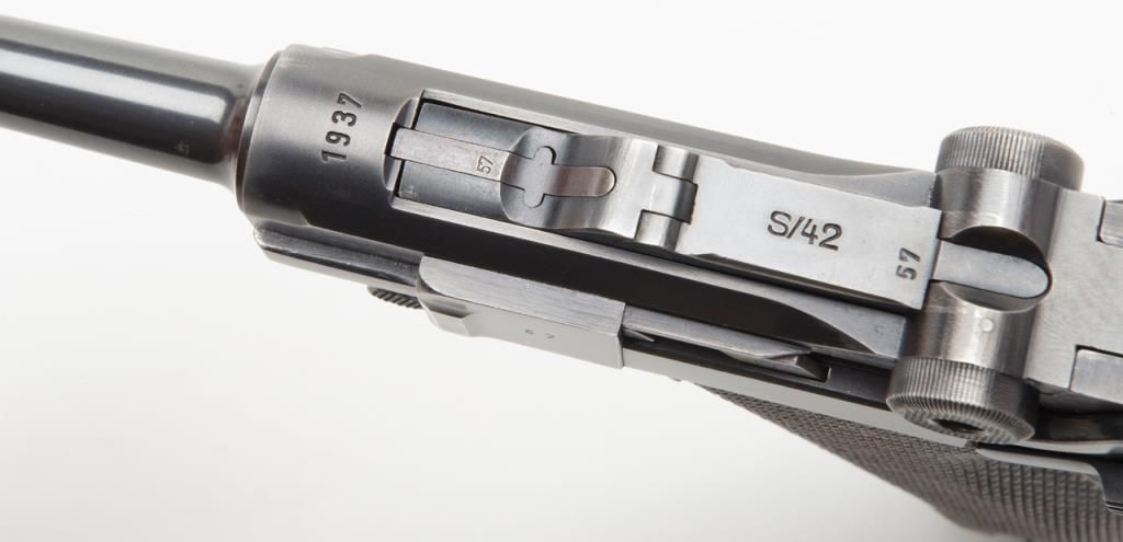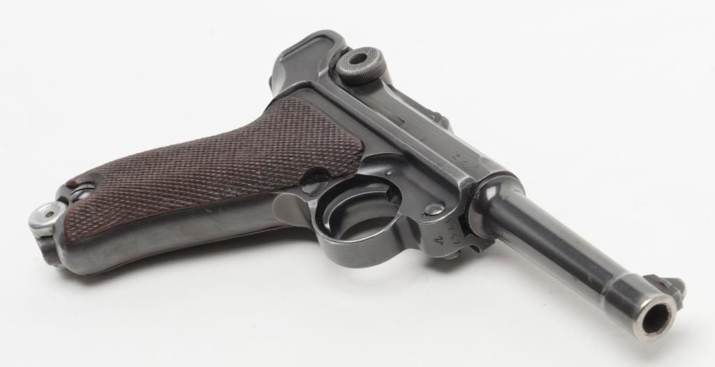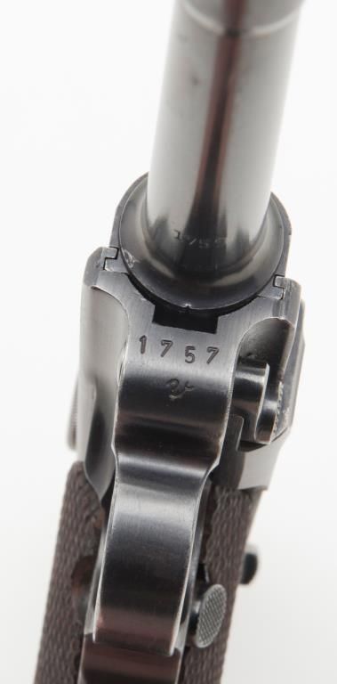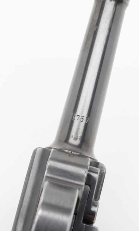 1937 dated nazi era Luger by Mauser, serial #1757 V suffix, all matching except clip; 90-95% original blue, very good grips, bright bore; normal high point and slight wear from use. An estate piece. (C&R). Est.: $900-$1,800.