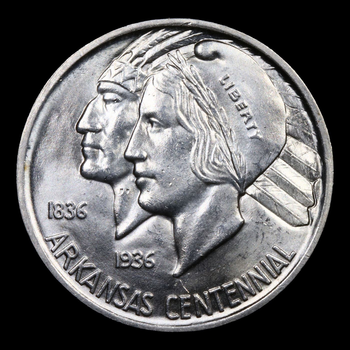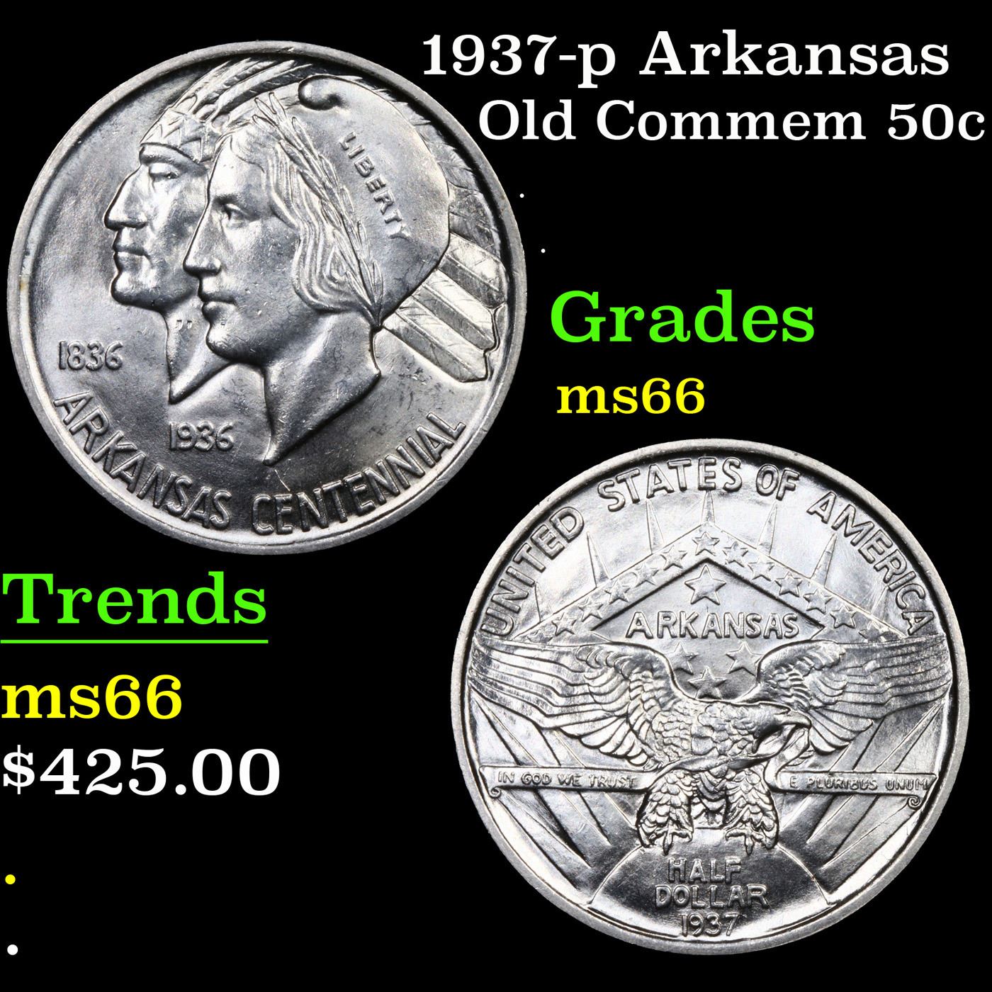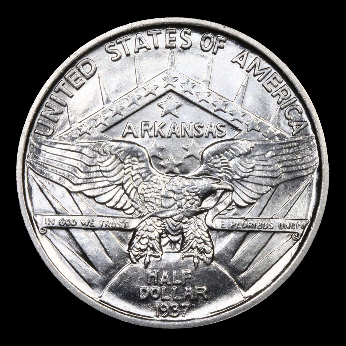 1937-p Arkansas Old Commem Half Dollar 50c Grades GEM+ Unc. Commemorative coins were authorized to celebrate the 100th anniversary of the admission of Arkansas into the Union. The Arkansas Centennial Half Dollars ended up being issued during five separate years, across three different mints. The coins became controversial due to the stream of variations created specifically to market to collectors, as well as the escalating issue prices as mintage for later issues became smaller.The obverse design features the head of Liberty and a Native American in headdress. Although this is now considered to be the obverse of the coin, there was initially some confusion and US Mint records and some references refer to this side as the reverse. In 1936, a new design was issued for this side of the coin, featuring a Senator who was living at the time of issue. The 1936 Robinson-Arkansas Half Dollar is considered a separate issue by most collectors.The reverse of the coin features the image of an eagle with wings spread, perched on the rising sun with rays emanating upwards. In the background a geometrical shape appears with the word “Arkansas” at center, amidst an arrangement of stars. Both the obverse and reverse design designed by Edward Everett Burr, following models prepared by Emily Bates.At the onset, the Arkansas Half Dollar was struck in a modest quantity of 13,012 pieces at the Philadelphia Mint with an additional 5,505 from Denver and 5,506 from San Francisco. The Philadelphia issues were sold at an issue price of $1 each, while the mint marked coins were purchased in a bulk transaction by a coin dealer and subsequently sold for $2.75 each. This initial situation was a taste of things to come.In the following year, coins from three different mints were initially offered for $1 each, but the price was quickly raised to $1.50 per coin, and eventually sold as sets of three coins for $6.75. The following year three coin sets were sold at $8.75, which was eventually raised to $10. This would also be the price of the 1939 sets.