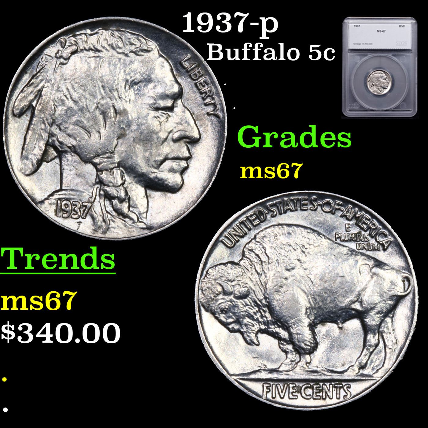 1937-p Buffalo Nickel 5c Graded ms67 BY SEGS.