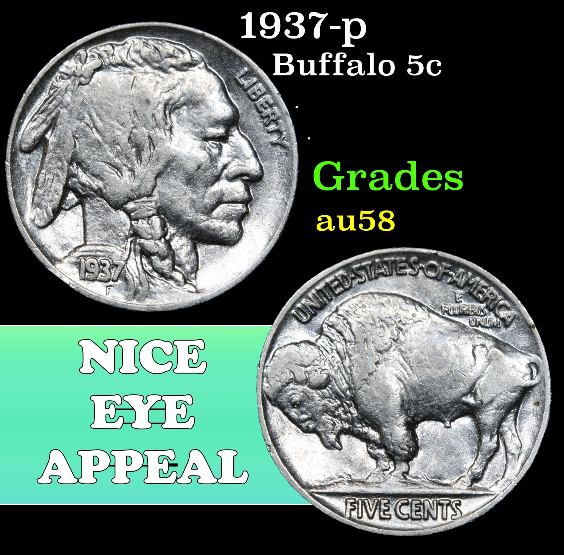1937-p . . Buffalo Nickel 5c Grades Choice AU/BU Slider.
