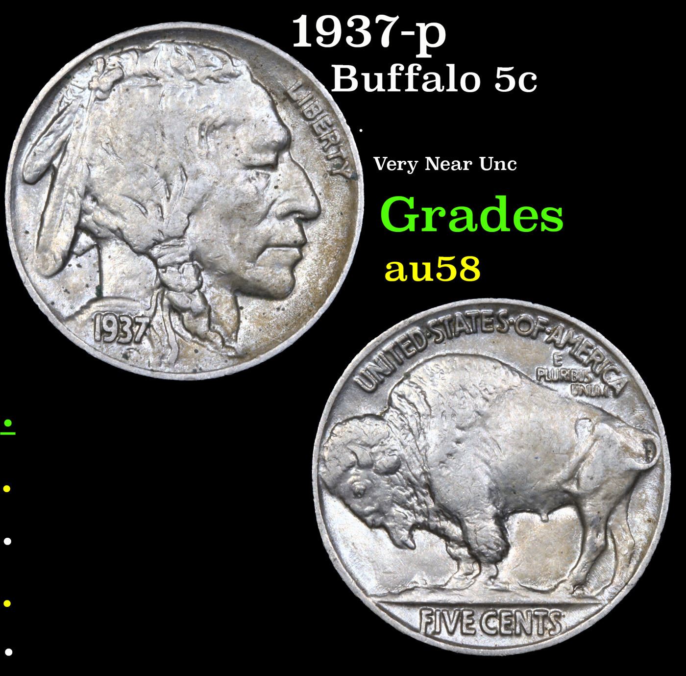 1937-p Buffalo Nickel 5c Grades Choice AU/BU Slider.
