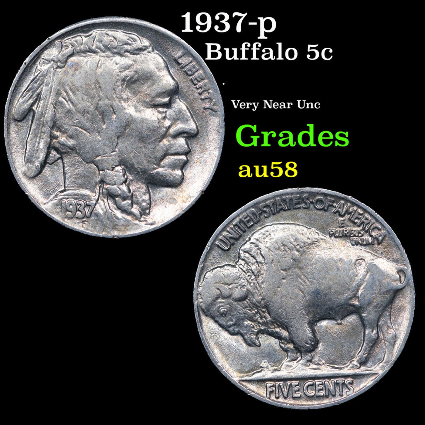1937-p Buffalo Nickel 5c Grades Choice AU/BU Slider.
