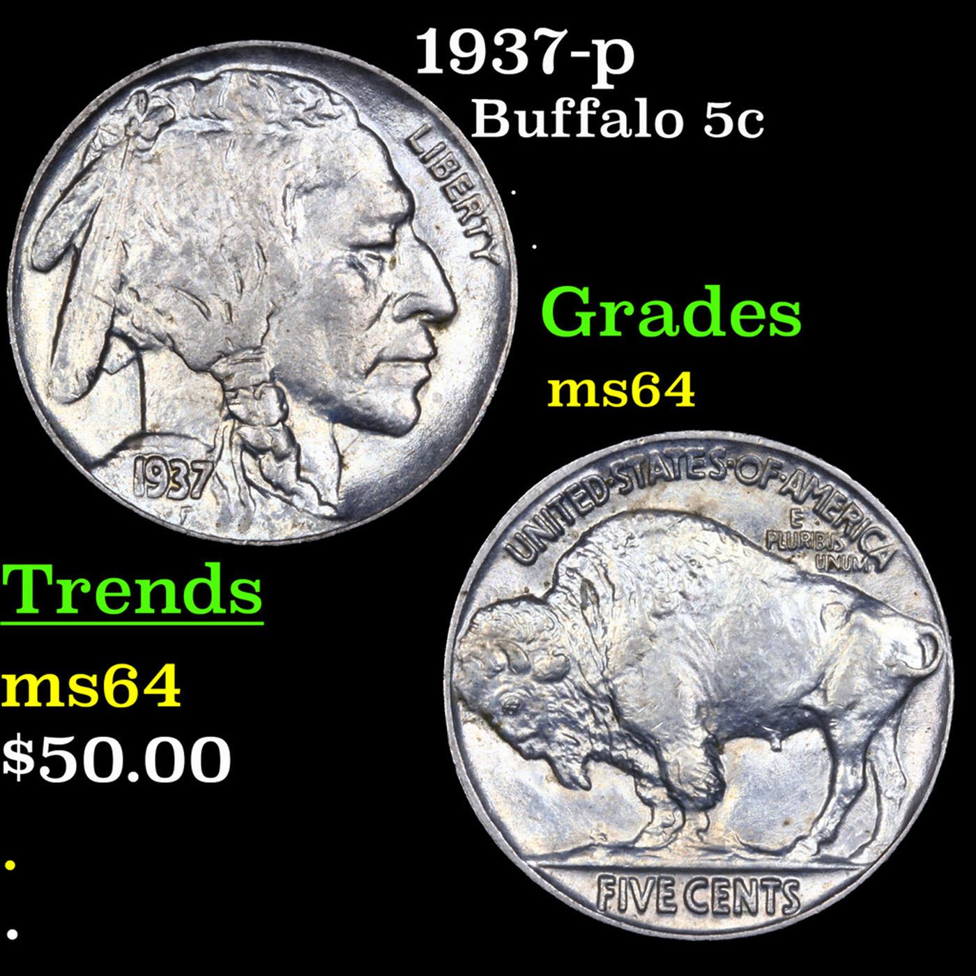 1937-p Buffalo Nickel 5c Grades Choice Unc.