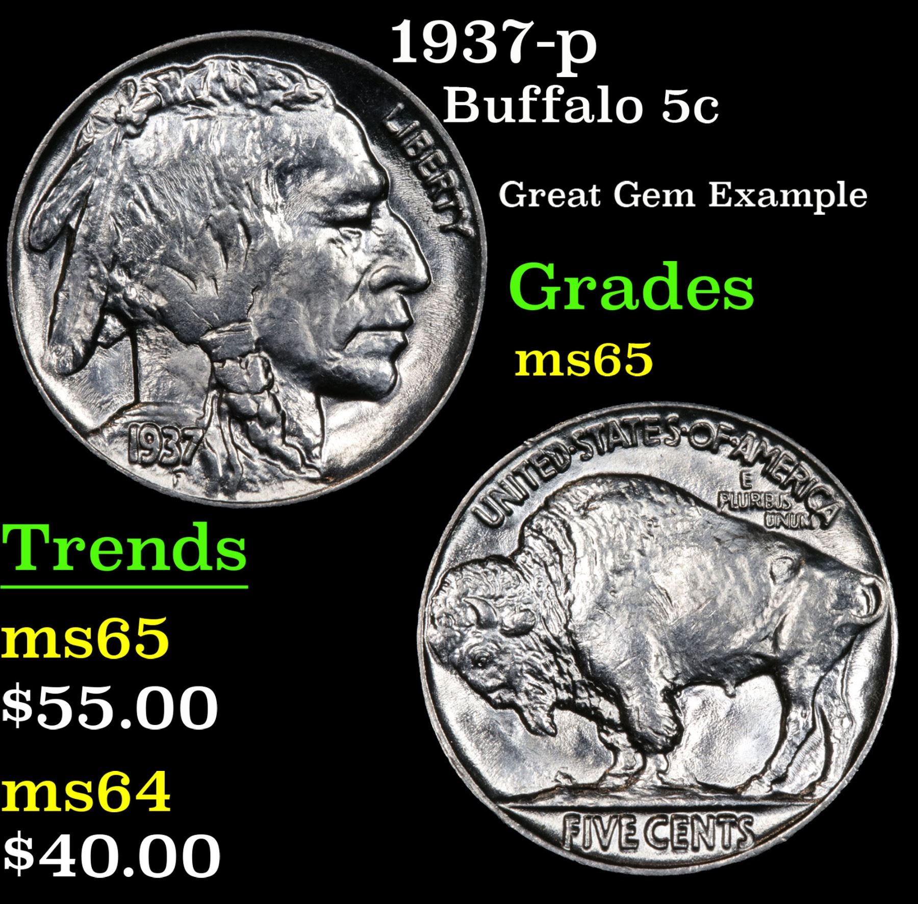 1937-p . Great Gem Example Buffalo Nickel 5c Grades GEM Unc.