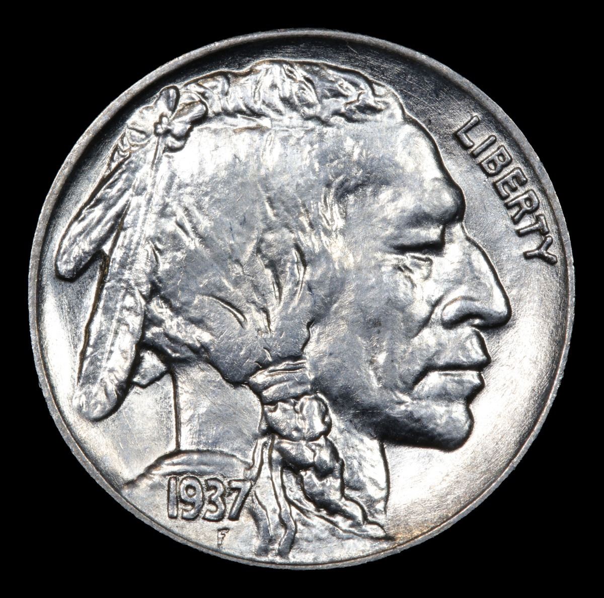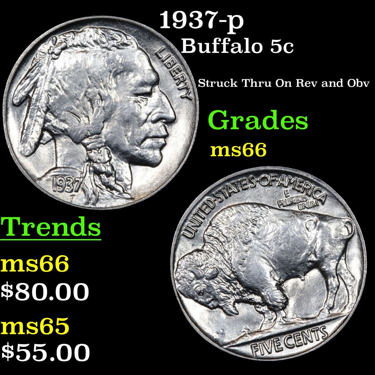 1937-p Struck Thru On Rev and Obv . Buffalo Nickel 5c Grades GEM+ Unc.
