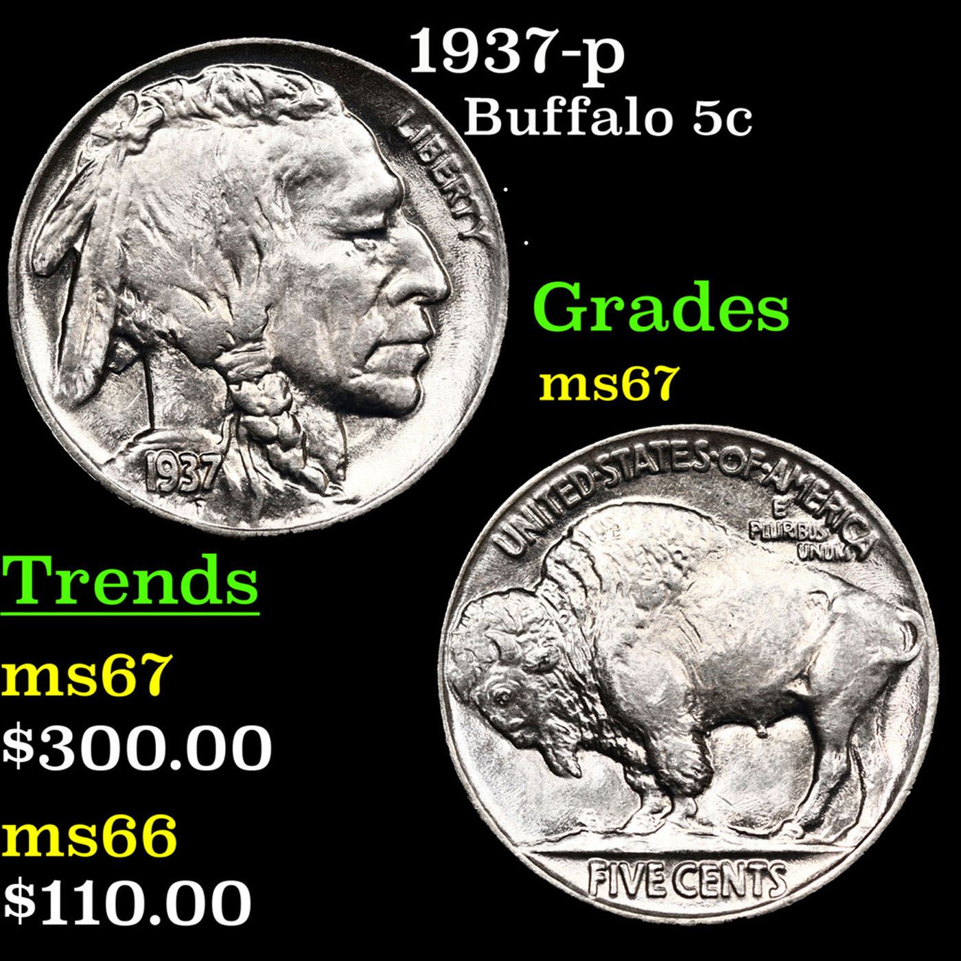 1937-p Buffalo Nickel 5c Grades GEM++ Unc.