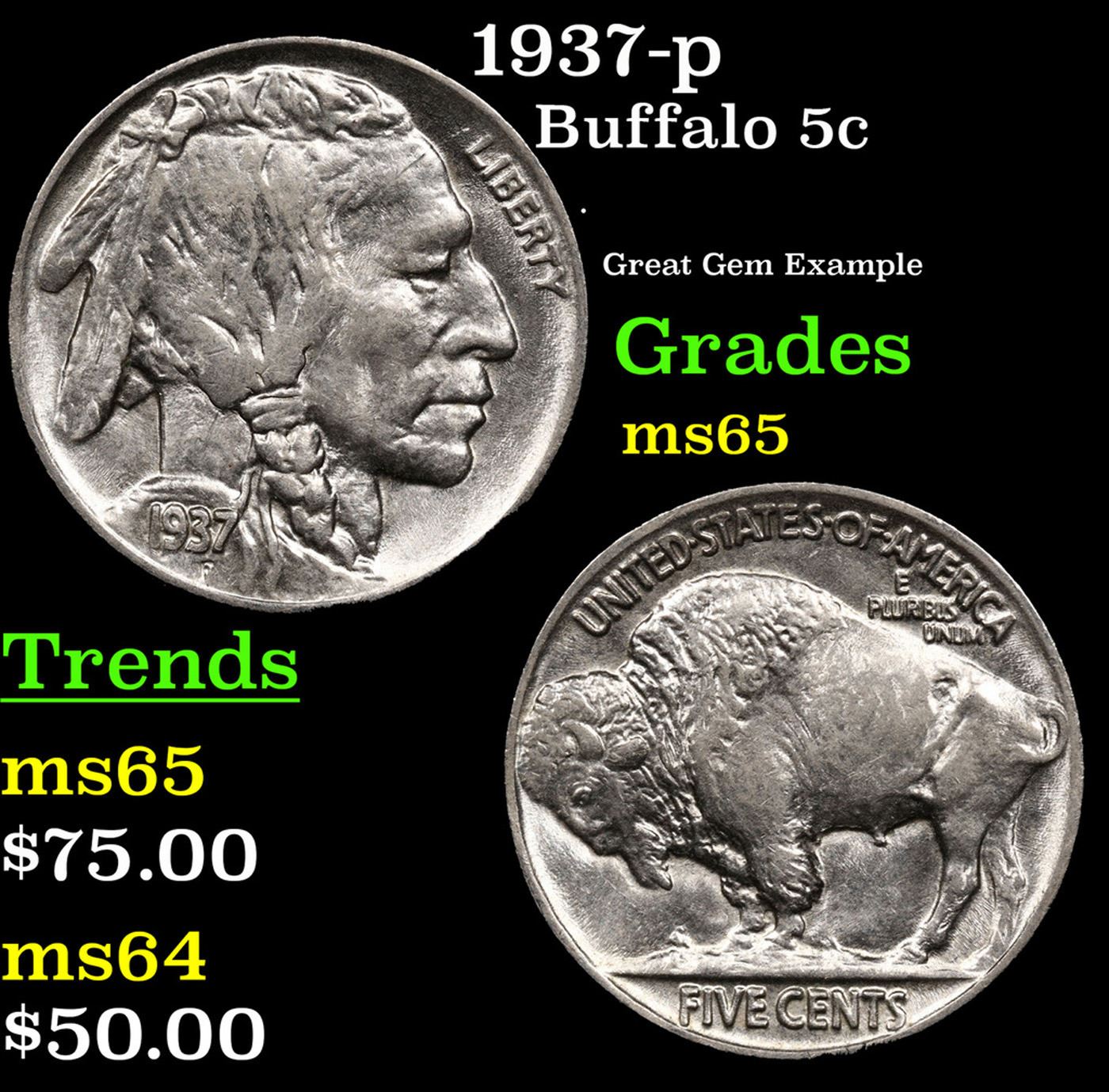 1937-p Buffalo Nickel 5c Grades GEM Unc.
