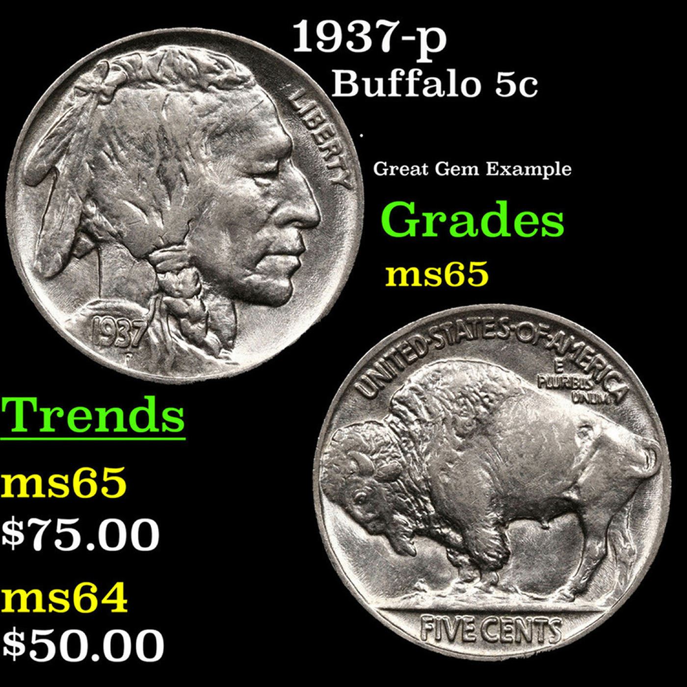 1937-p Buffalo Nickel 5c Grades GEM Unc.