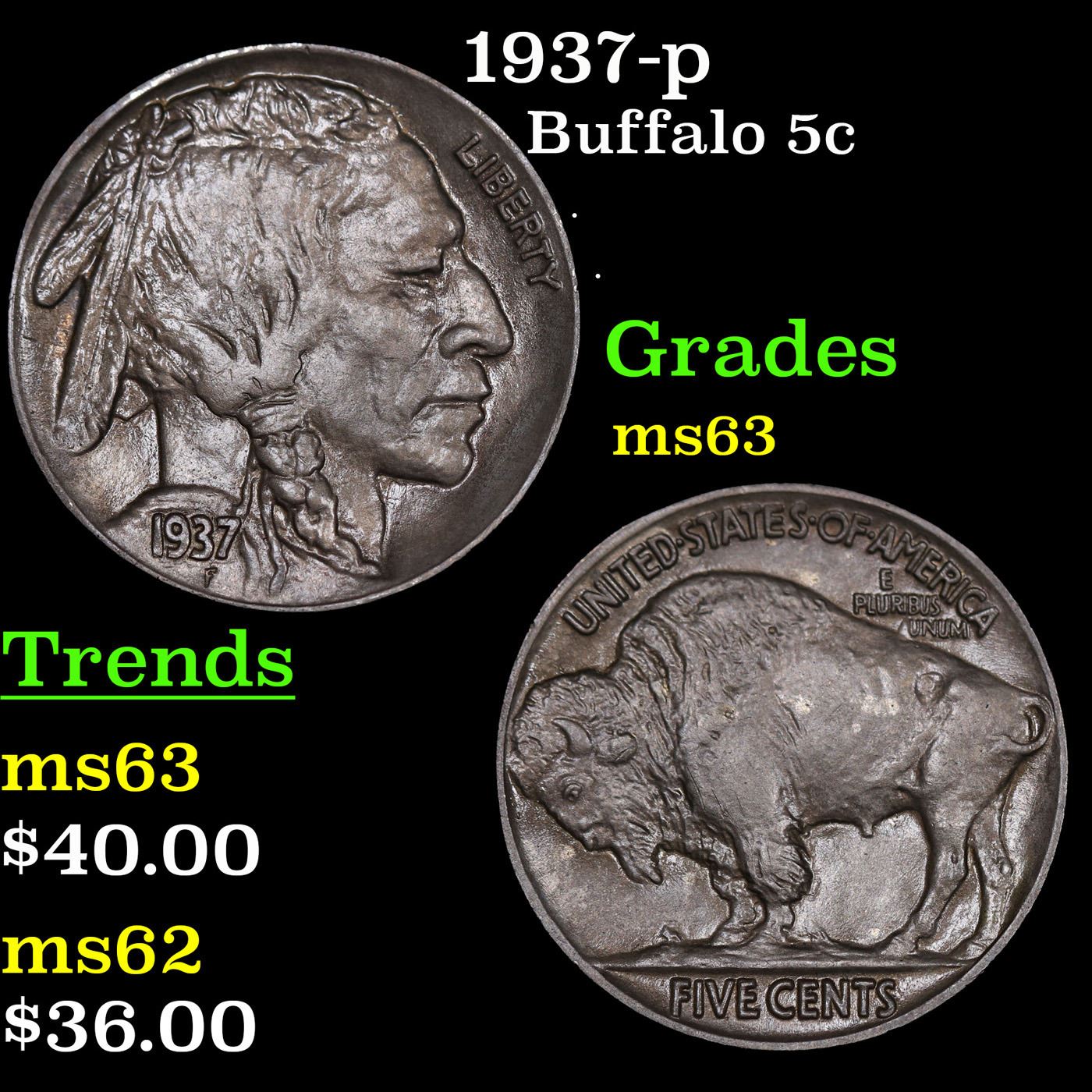 1937-p Buffalo Nickel 5c Grades Select Unc.