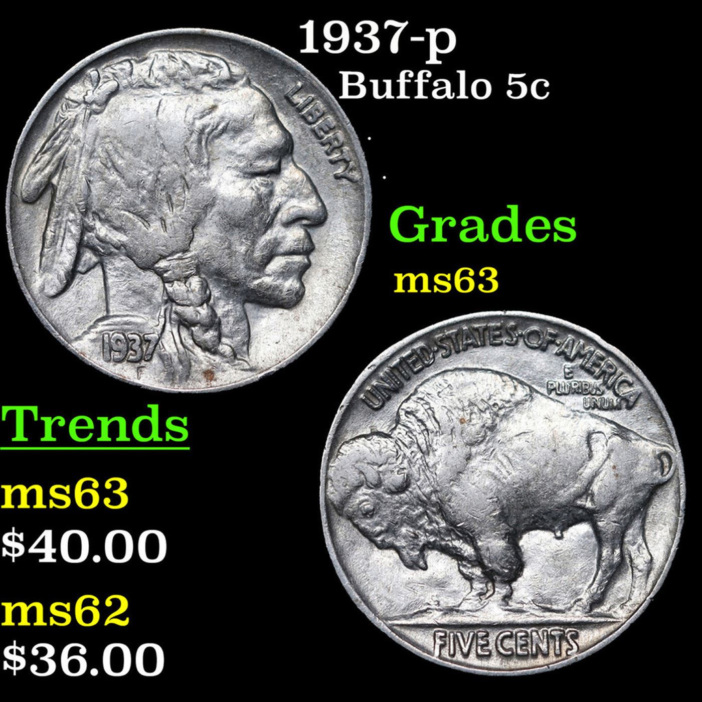 1937-p Buffalo Nickel 5c Grades Select Unc.