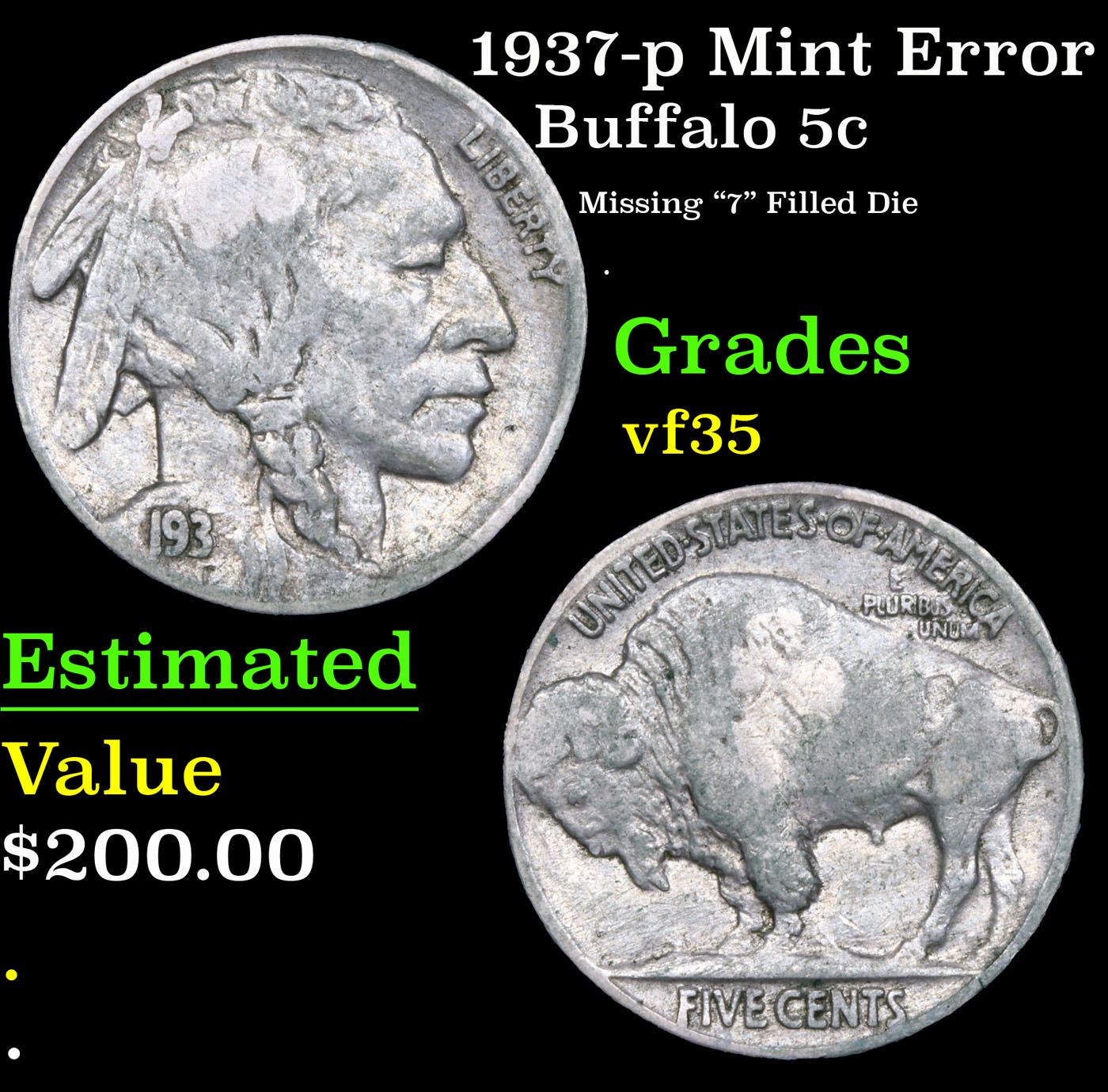 1937-p Mint Error Buffalo Nickel 5c Grades vf++.