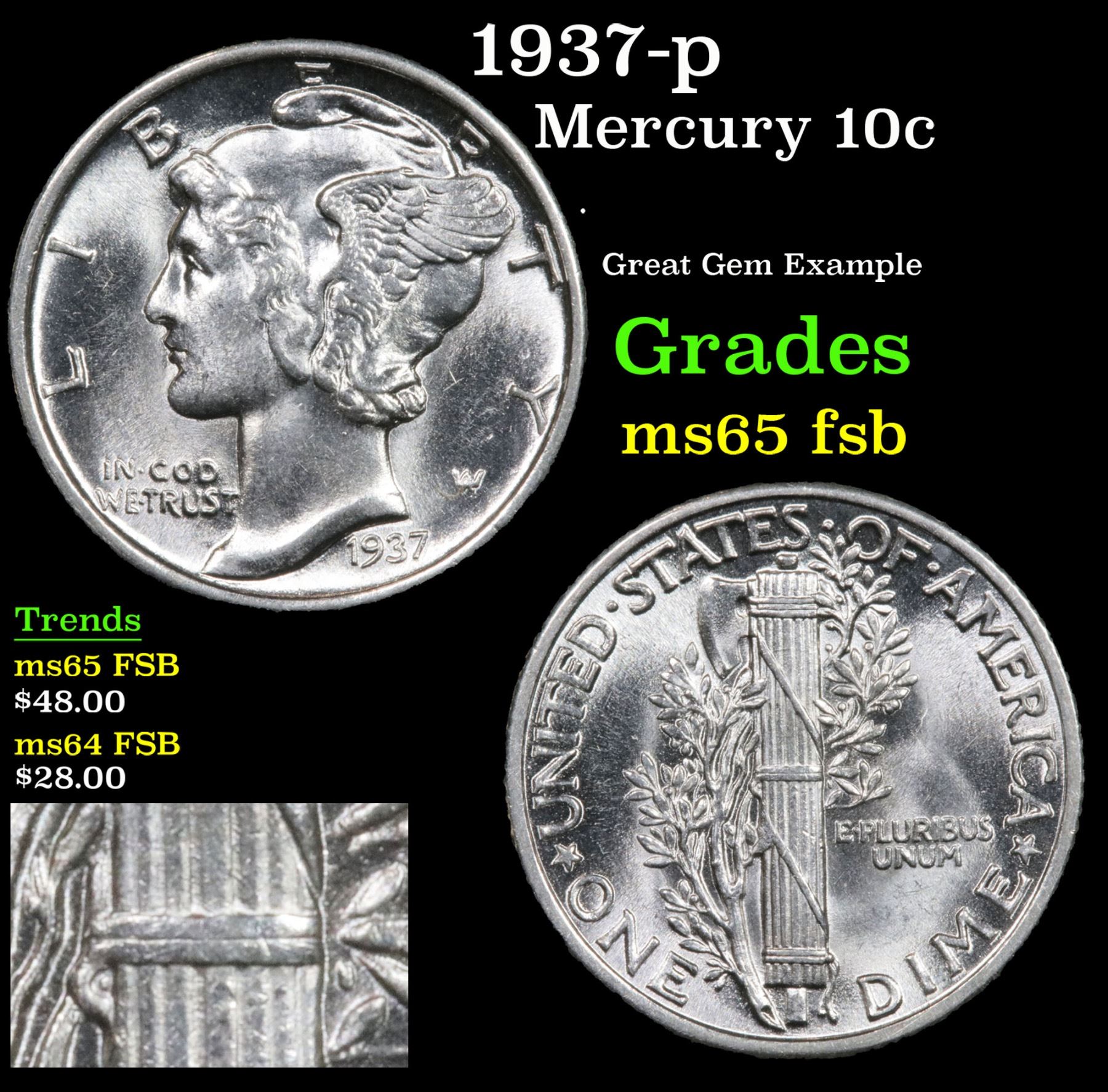 1937-p . Great Gem Example Mercury Dime 10c Grades GEM FSB.