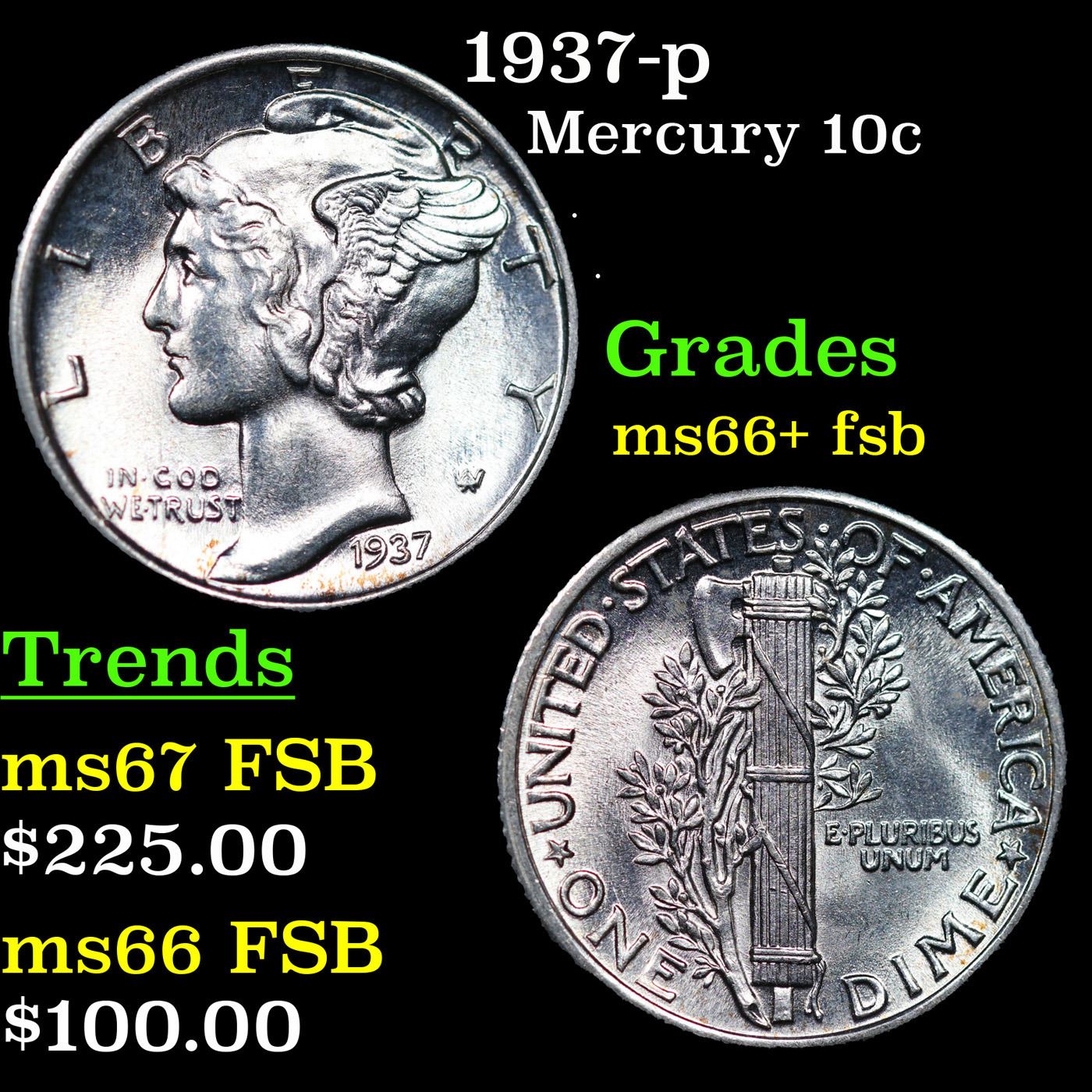 1937-p Mercury Dime 10c Grades GEM++ FSB.