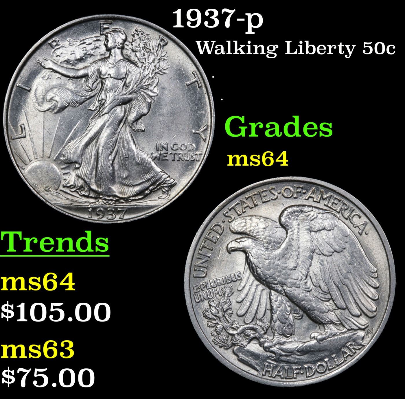1937-p Walking Liberty Half Dollar 50c Grades Choice Unc.