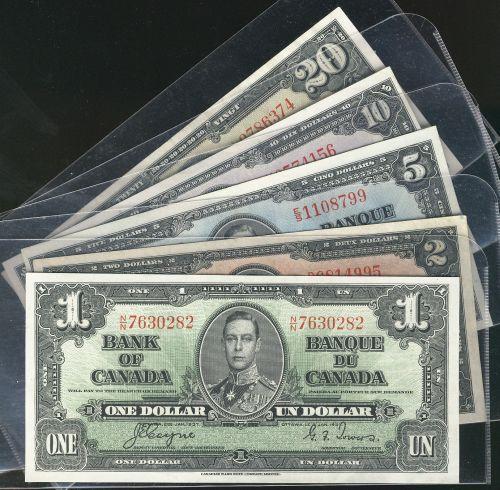 1937 partial set including five notes. $1, $2, $5, $10 and $20. Grades vary from EF+ to AU+. A very nice and attractive set!