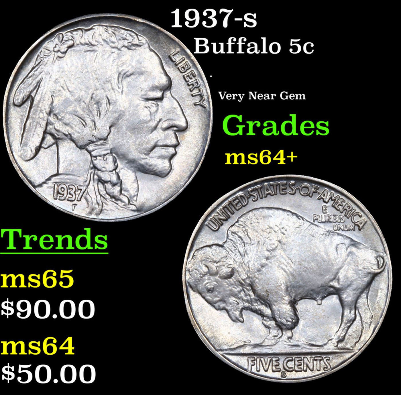 1937-s Buffalo Nickel 5c Grades Choice+ Unc.
