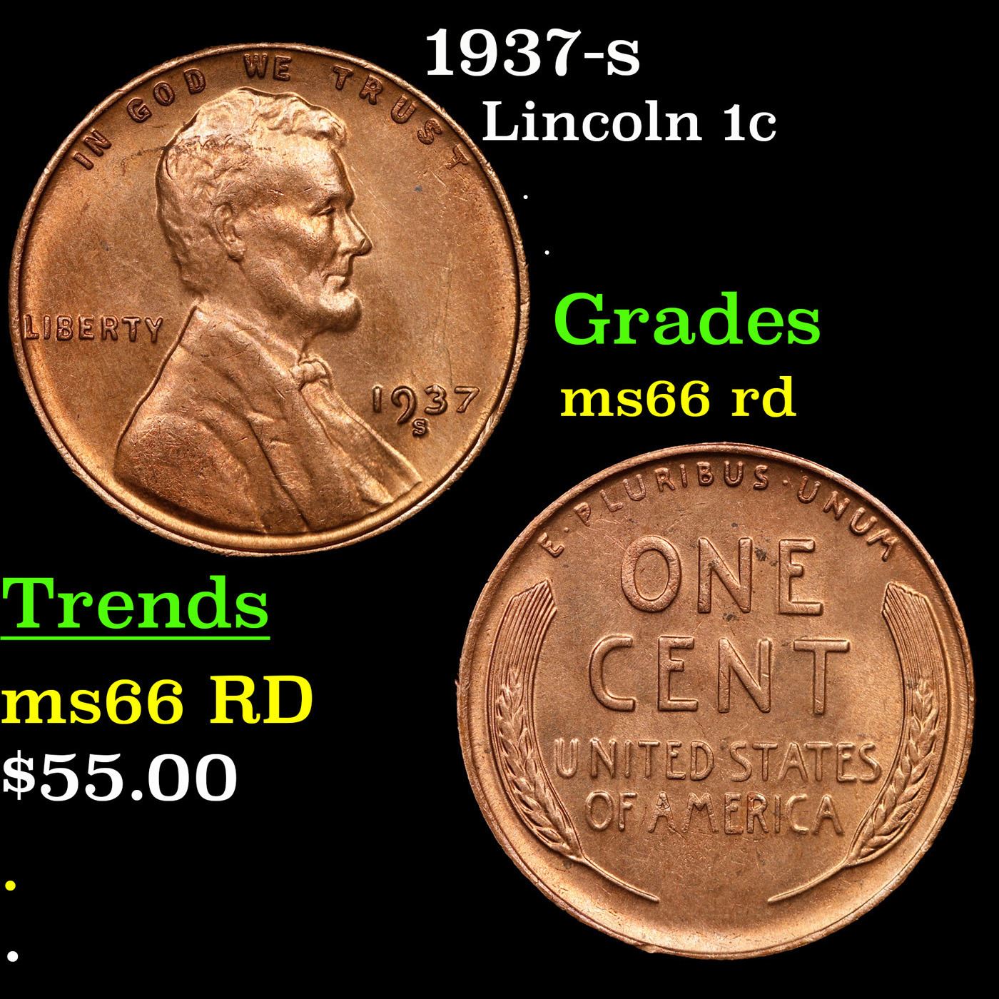 1937-s Lincoln Cent 1c Grades GEM+ Unc RD.