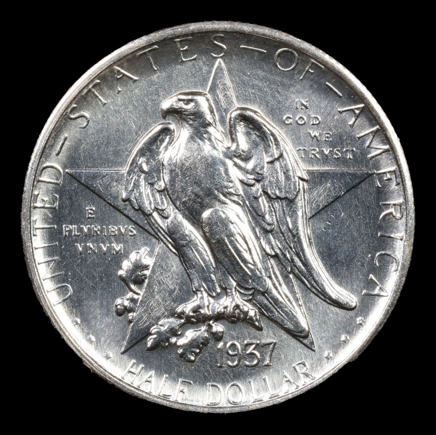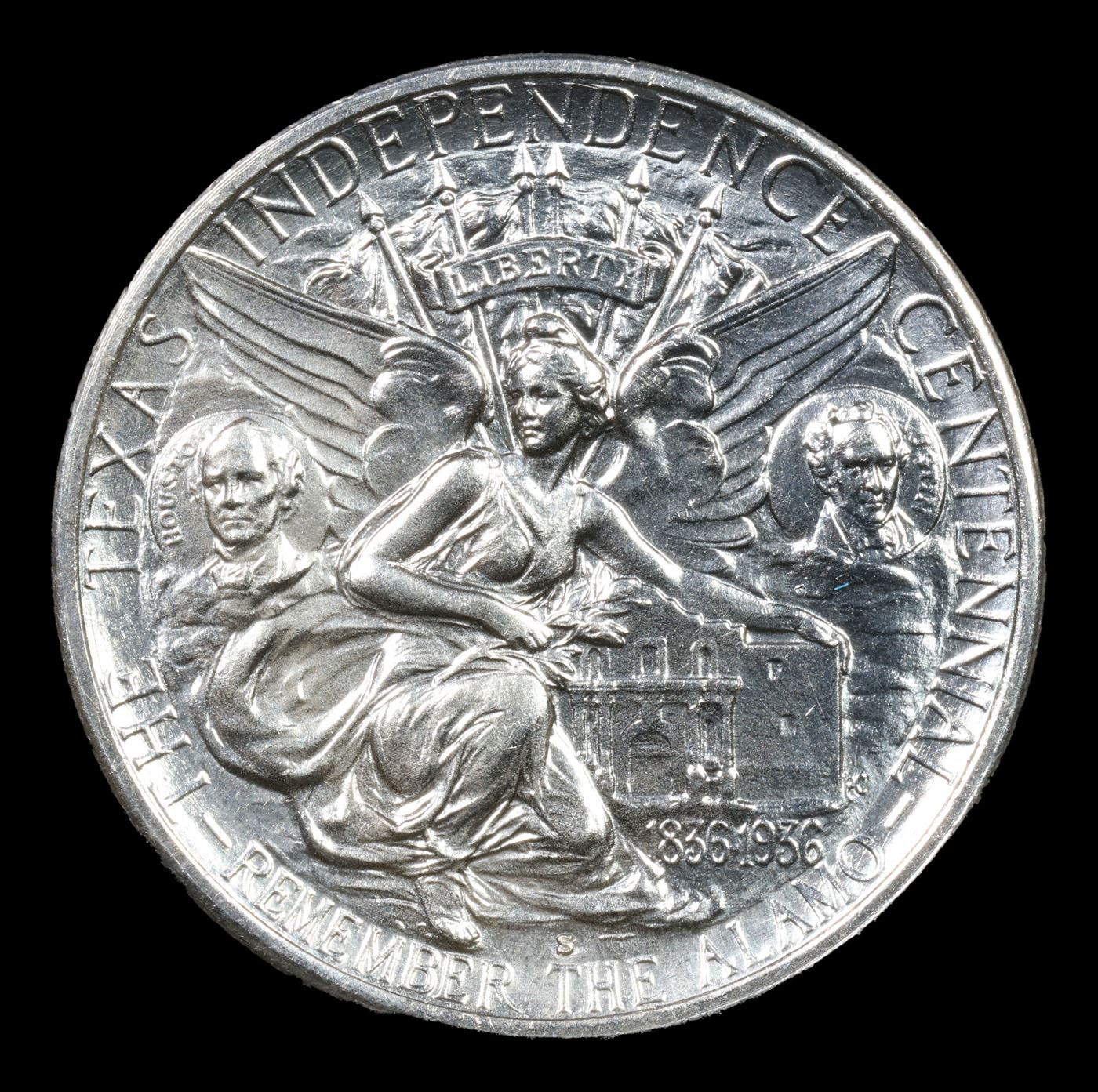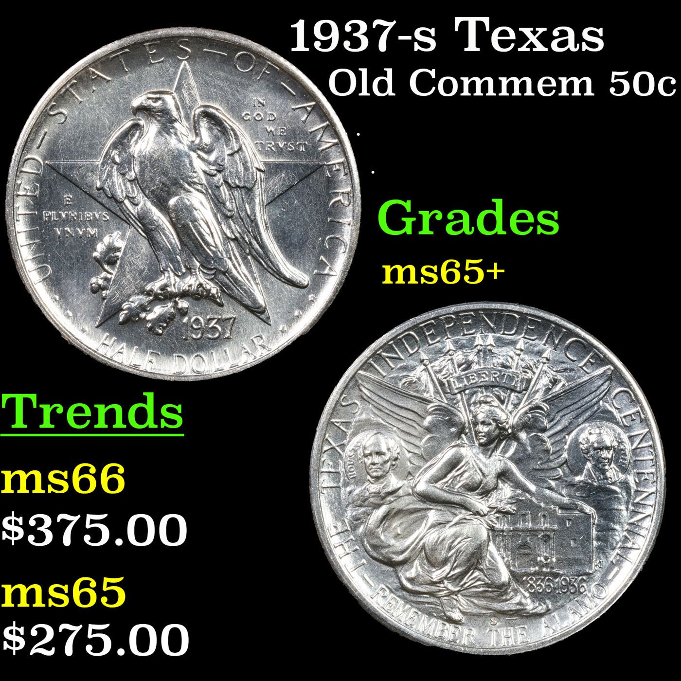 1937-s Texas Old Commem Half Dollar 50c Grades GEM+ Unc. The Texas Centennial half dollar commemorative coin was minted to honor the Centennial of Texas's independence from Mexico. Early in the administration of President Franklin Delano Roosevelt, on June 15, 1933, Congress passed an act to authorize the coinage of silver half dollars "in commemoration of the one hundredth anniversary in 1936 of the independence of Texas, and of the noble and heroic sacrifices of her pioneers, whose revered memory has been an inspiration to her sons and daughters during the past century." The Texas commemorative series ran from 1934 thru 1938 and 13 different dates and mint mark combinations were issued. For each of the years 1935 thru 1938, coins were struck at all three Mints; Philadelphia, Denver, and San Francisco. But for the 1934 Texas, only Philadelphia Mint coins were issued. The original issue price was $1.00 per coin.The coin was designed by Pompeo Coppini, a Texan. The obverse depicts an Eagle sitting on a branch in front of the Lone Star, the symbol of Texas. The reverse depicts the goddess Victory spreading her wings over the Alamo. It also depicts Sam Houston on her left and Stephen F. Austin on her right. The Six Flags of Texas fly above her head. Under her it reads REMEMBER THE ALAMO. Over Sam Houston, Victory, and Stephen F. Austin it reads THE TEXAS INDEPENDENCE CENTENNIAL.