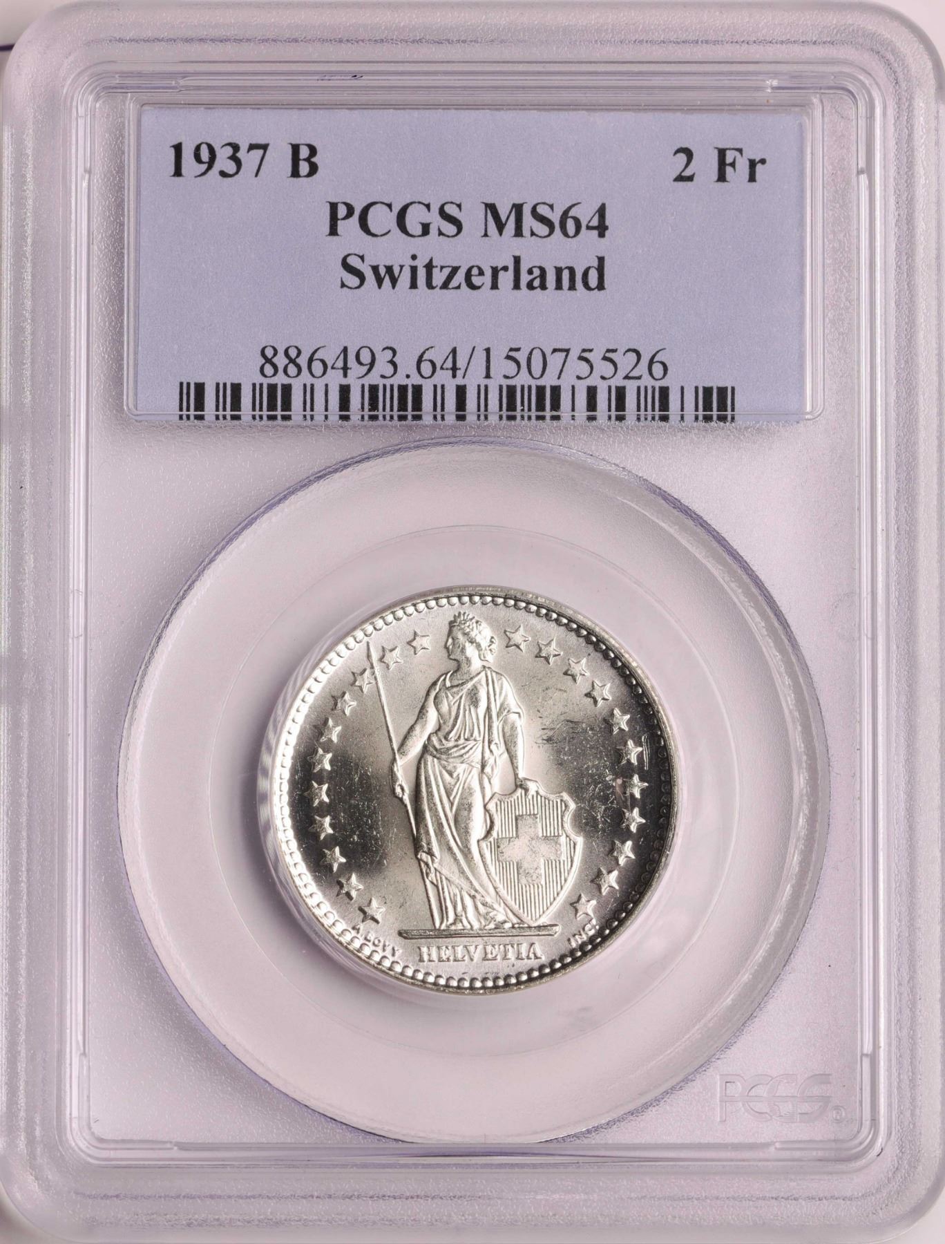 One 1937B Switzerland 2 Francs Silver Coin PCGS MS64.