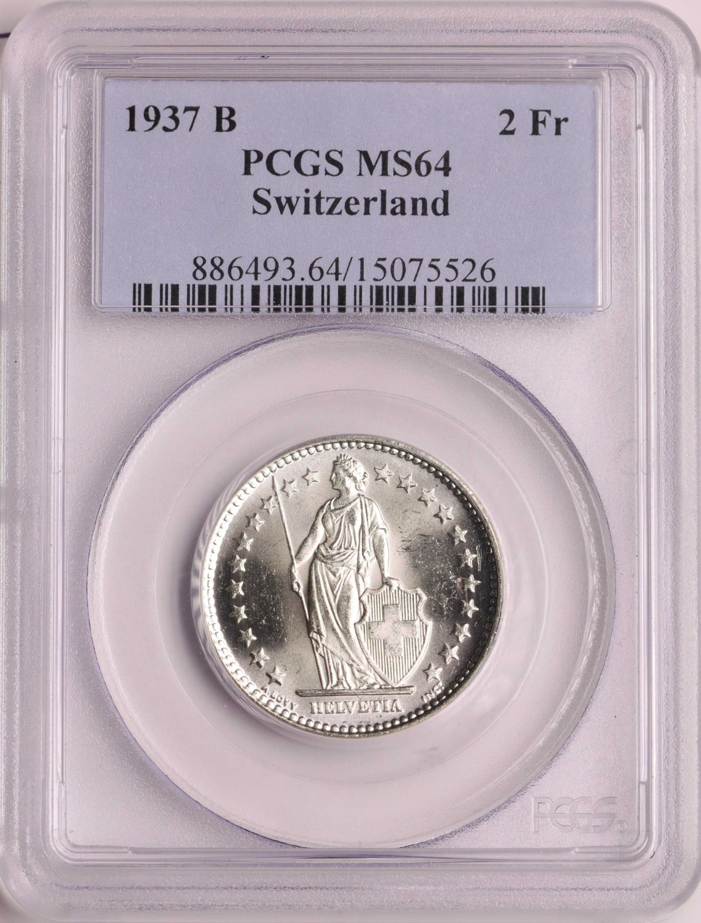 One 1937B Switzerland 2 Francs Silver Coin PCGS MS64.