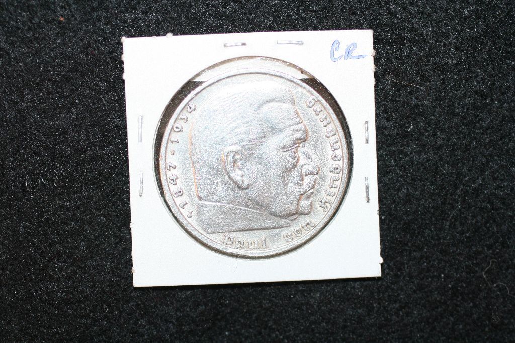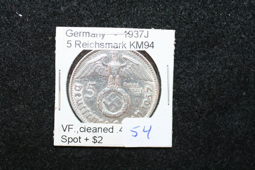 1937J German 5 Reichsmark Foreign Coin W/Flying Eagle Holding Swatstika; VF, Cleaned