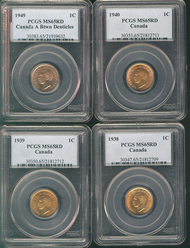 1938 1¢, 1939, 1940 & 1949 A Btwn PCGS MS65RD. Lot of 4 gem examples.