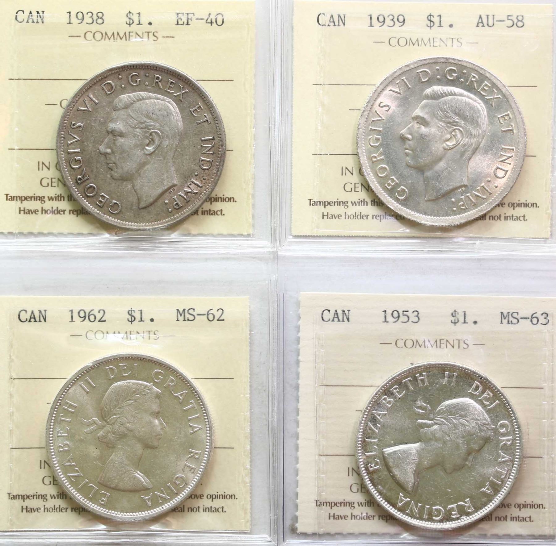 1938 $1, 1939, 1953 "NSF", 1962 All 4 coins ICCS Extra Fine-40 to Choice Mint State-63.