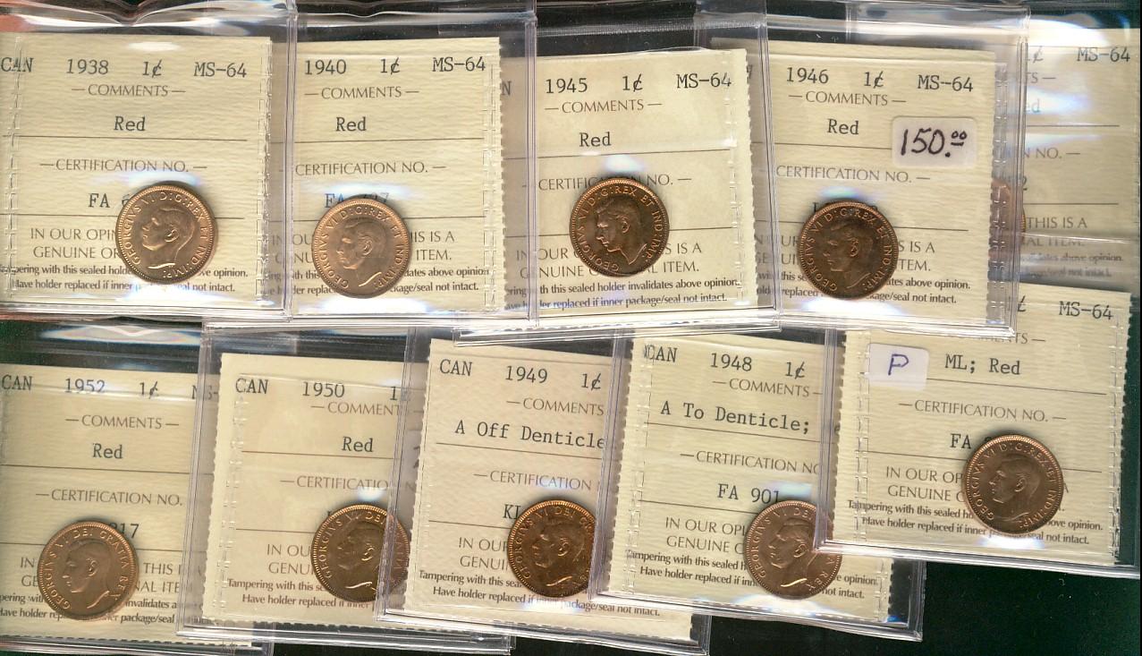 1938 1¢, 1940, 1946, 1946, 1947ML, 1948 A Off, 1949 A to, 1950, 1952 & 1954 SF MS64RD. Lot of 10 ICCS graded coins.