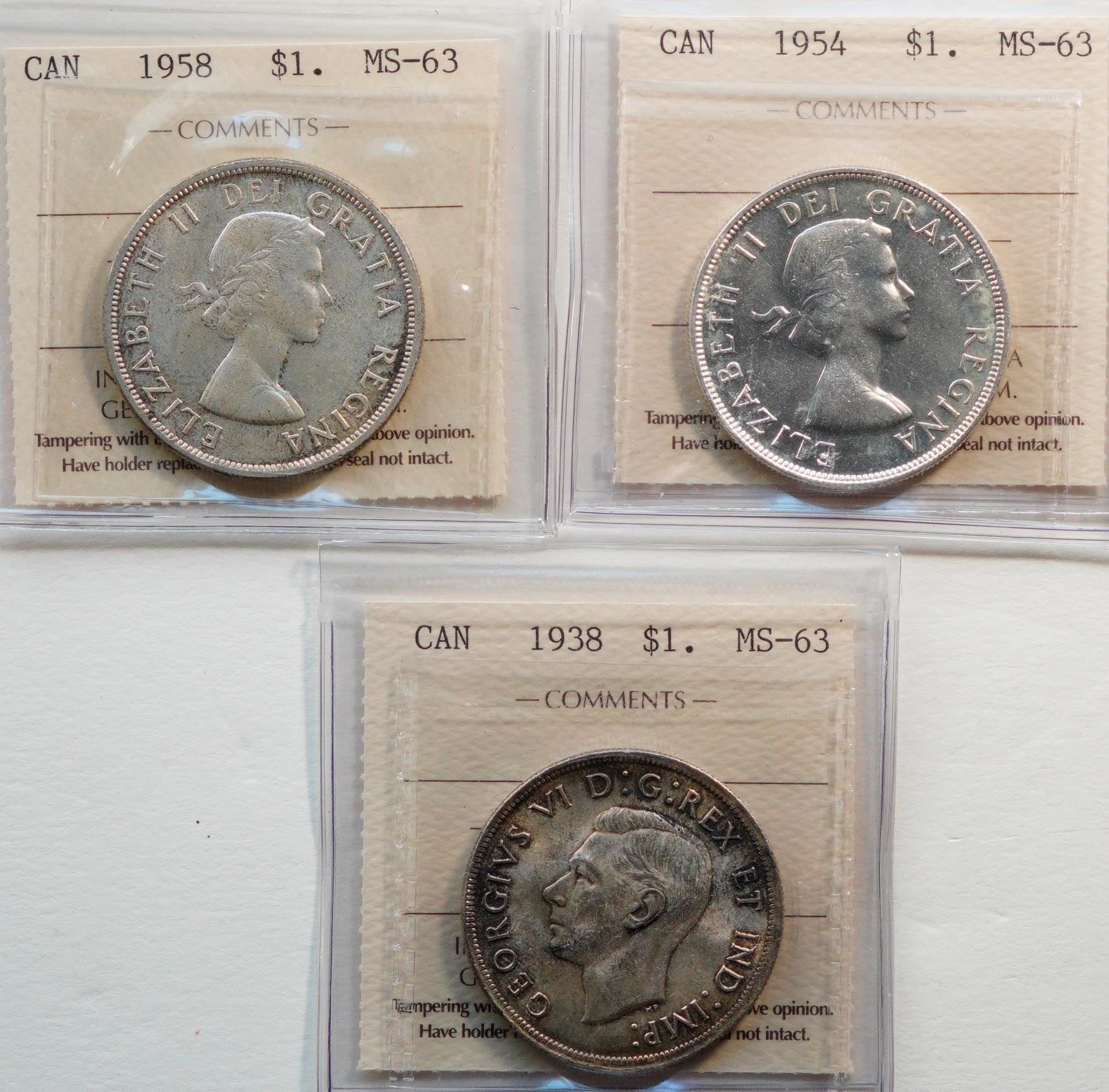 1938 $1, 1958, 1954. Lot of 3 coins ICCS Choice Mint State-63