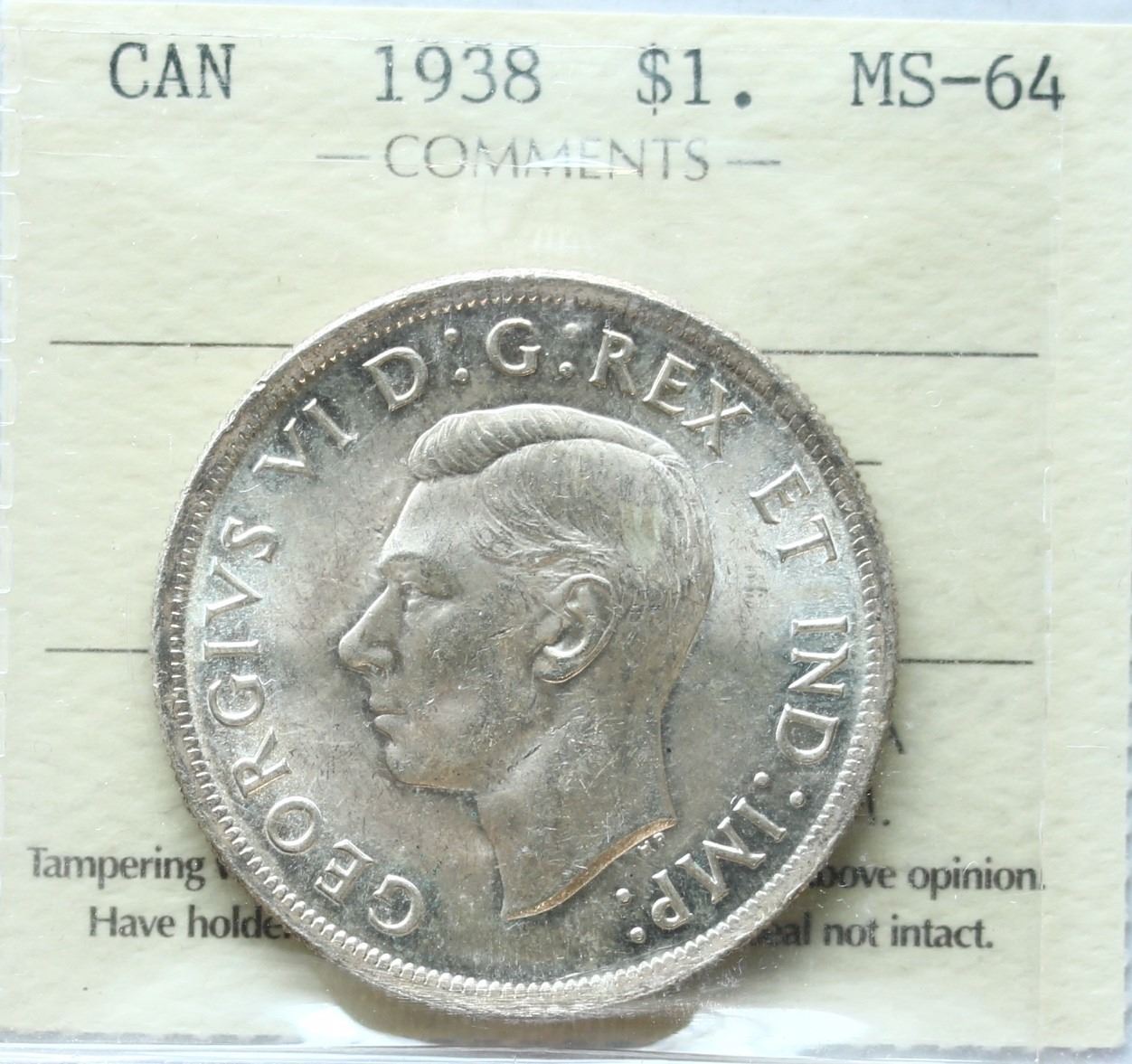 1938 $1 ICCS Choice Mint State-64. Lustrous example with light orange tints.
