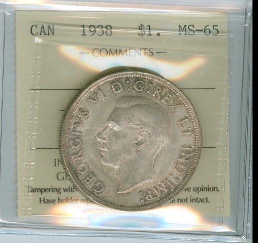 1938 $1 ICCS MS65. A Gem issue with a light hazel and pinkish tone. A very attractive example with lots of lustre.