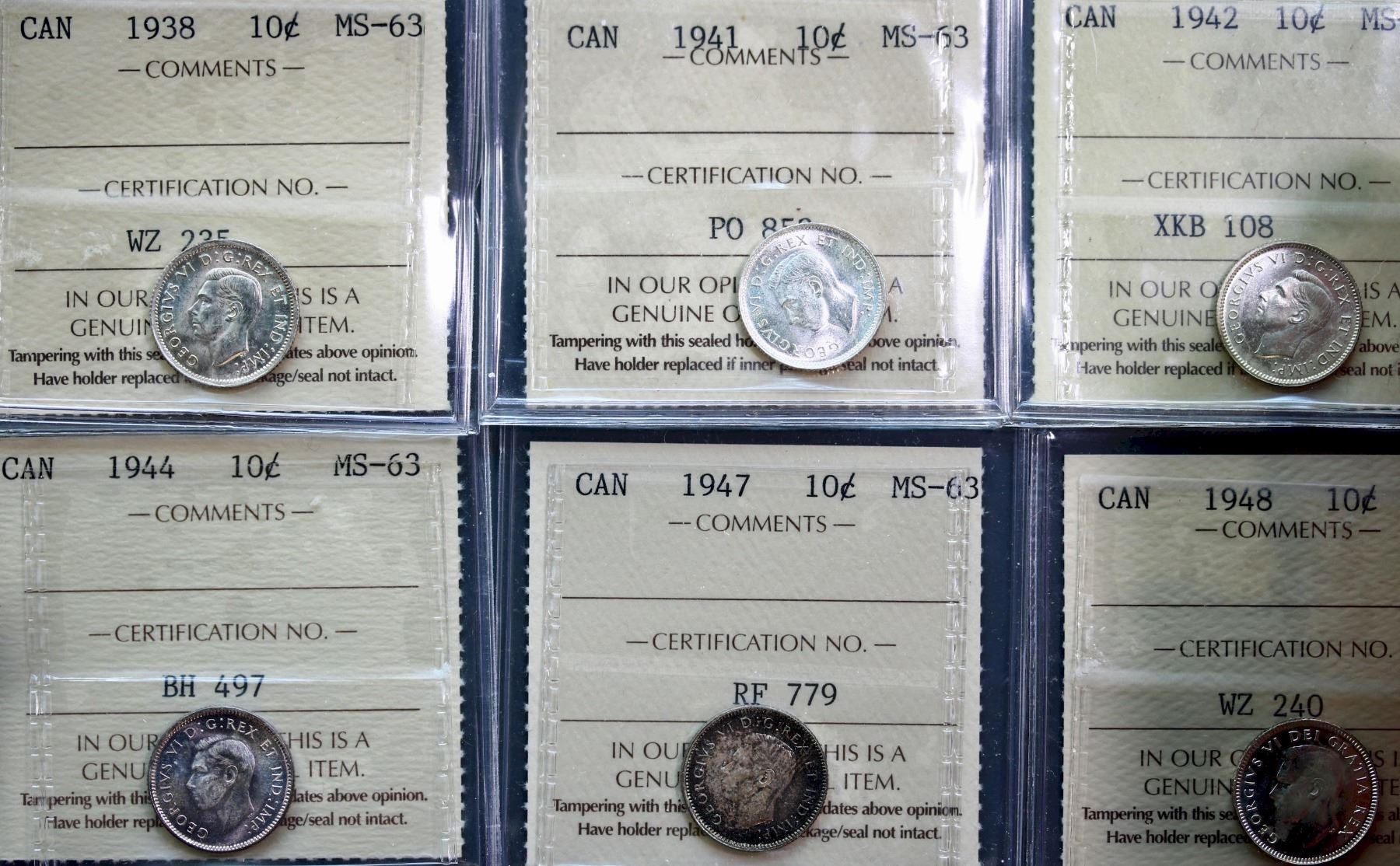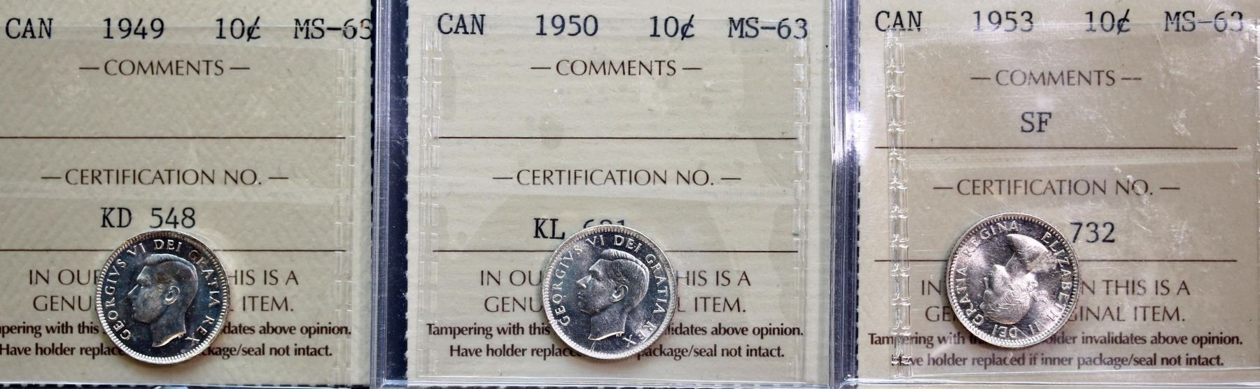 1938 10¢, 1941, 1942, 1944, 1947, 1948, 1949, 1950, and 1953 SF, all ICCS Choice Mint State-63, lot of 9 coins.