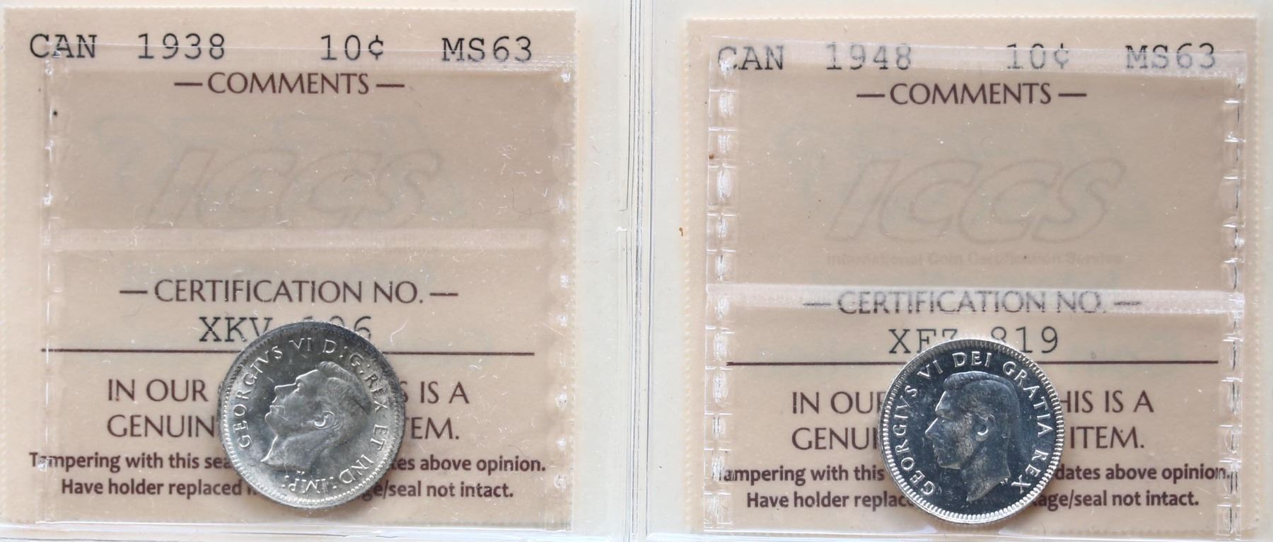 1938 10¢, 1948. Both coins ICCS Choice Mint State-63
