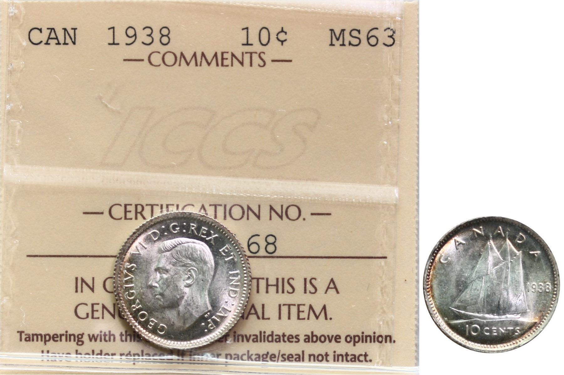 1938 10¢ ICCS Choice Mint State-63 Brilliant and lustrous.