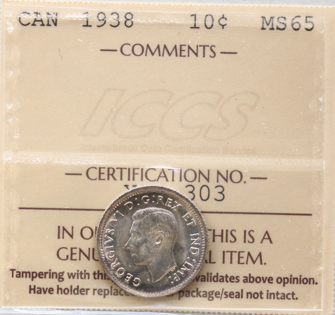 1938 10¢ ICCS Gem Mint State-65, Blast white example. Flashy!