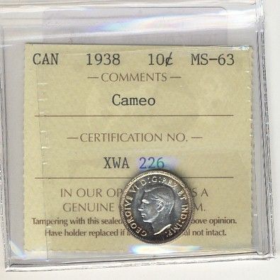 1938 10¢ ICCS MS63 Cameo.