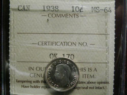 1938 10¢ ICCS MS64. Brilliant and lustrous. A sharp example.
