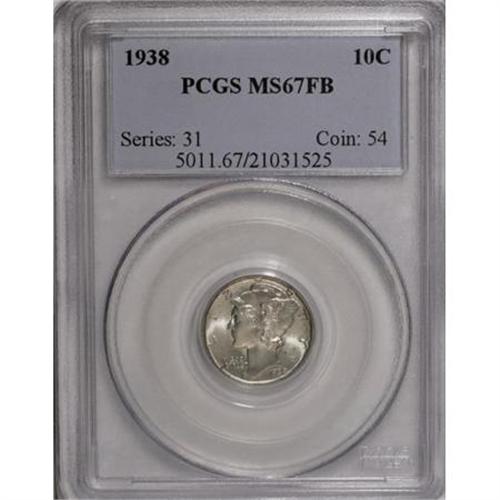 <B>1938 10C MS67 Full Bands PCGS.</B></I> PCGS Population (201/7). NGC Census: (120/3). Mintage: 22,198,728. Numismedia Wsl. Price for NGC/PCGS coin in MS67: $200. (#5011)<BR><BR><B>Coin Engraver:</B> Adolph A. Weinman<BR><BR><b>Shipping:</b> Coins & Currency (<a target="_blank" href="http://www.heritageauctions.com/common/shipping.php">view shipping information</a>)