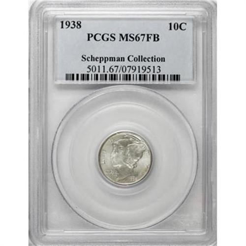 <B>1938 10C MS67 Full Bands PCGS.</B></I> Rose and blue accents visit the silver-gray surfaces of this shining Full Bands Superb Gem. The sharply struck devices and strongly lustrous fields show equally impressive preservation. PCGS has graded only seven finer Full Bands pieces (12/07).<BR><I>From The Scheppman Collection, #4 PCGS Registry of Full Band Mercury Dimes.</B></I><BR><BR><B>Coin Engraver:</B> Adolph A. Weinman<BR><BR><b>Shipping:</b> Coins & Currency (<a target="_blank" href="http://www.heritageauctions.com/common/shipping.php">view shipping information</a>)