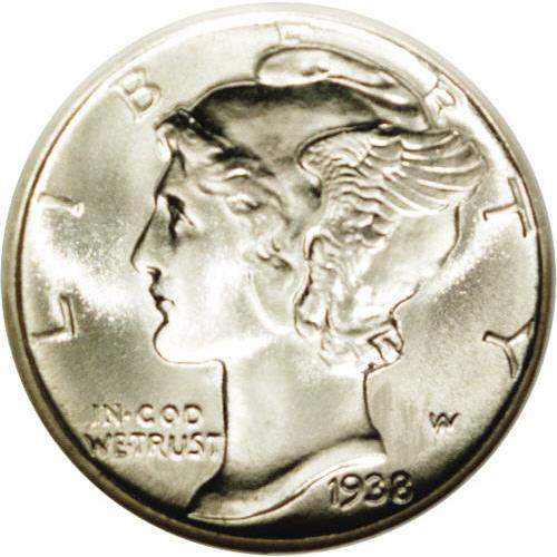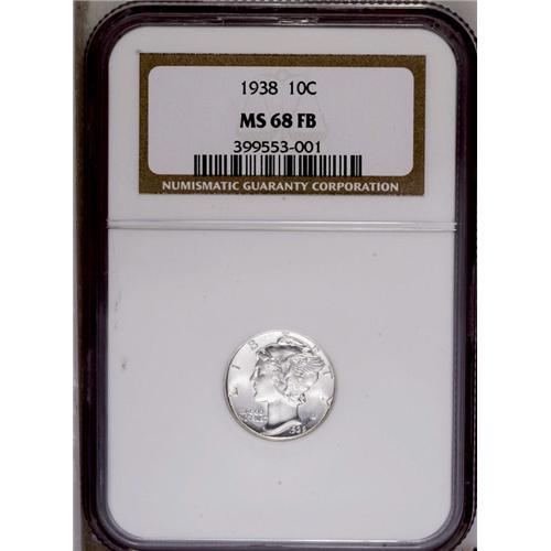 <B>1938<10C> MS68 Full Bands NGC.</B></I> Bright and lustrous with no apparent marks on either side, this coin is essentially perfect. Brilliant throughout, a couple of small areas of die polish are noted on the obverse. Only eight MS68 Full Bands specimens have been certified by both services combined (2/06).