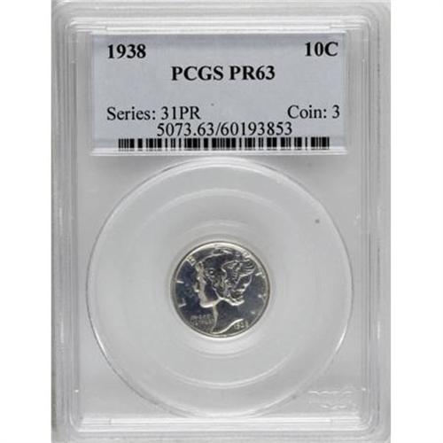 <B>1938 10C PR63 PCGS.</B></I> PCGS Population (139/2140). NGC Census: (43/1422). Mintage: 8,728. Numismedia Wsl. Price for NGC/PCGS coin in PR63: $220. (#5073)<BR><BR><B>Coin Engraver:</B> Adolph A. Weinman<BR><BR><b>Shipping:</b> Coins & Currency (<a target="_blank" href="http://www.heritageauctions.com/common/shipping.php">view shipping information</a>\)