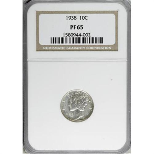 <B>1938 10C PR65 NGC.</B></I> NGC Census: (439/769). PCGS Population (810/775). Mintage: 8,728. Numismedia Wsl. Price for NGC/PCGS coin in PR65: $420. (#5073)<BR><BR><B>Coin Engraver:</B> Adolph A. Weinman<BR><BR><b>Shipping:</b> Coins & Currency (<a target="_blank" href="http://www.heritageauctions.com/common/shipping.php">view shipping information</a>\)