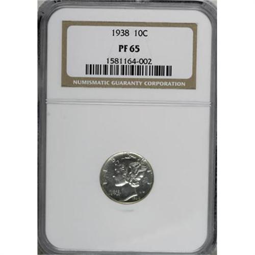 <B>1938 10C PR65 NGC.</B></I> NGC Census: (441/780). PCGS Population (811/787). Mintage: 8,728. Numismedia Wsl. Price for NGC/PCGS coin in PR65: $420. (#5073)<BR><BR><B>Coin Engraver:</B> Adolph A. Weinman<BR><BR><b>Shipping:</b> Coins & Currency (<a target="_blank" href="http://www.heritageauctions.com/common/shipping.php">view shipping information</a>)