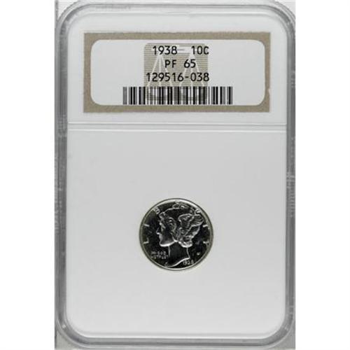 <B>1938 10C PR65 NGC.</B></I> NGC Census: (449/830). PCGS Population (815/789). Mintage: 8,728. Numismedia Wsl. Price for NGC/PCGS coin in PR65: $400. (#5073)<BR><BR><B>Coin Engraver:</B> Adolph A. Weinman<BR><BR><b>Shipping:</b> Coins & Currency (<a target="_blank" href="http://www.heritageauctions.com/common/shipping.php">view shipping information</a>)