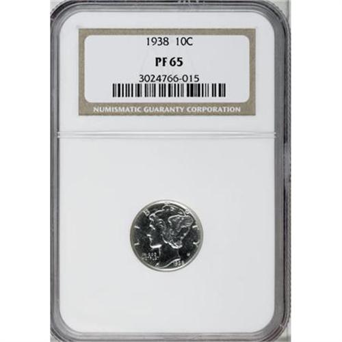 <B>1938 10C PR65 NGC.</B></I> NGC Census: (449/831). PCGS Population (816/791). Mintage: 8,728. Numismedia Wsl. Price for NGC/PCGS coin in PR65: $400. (#5073)<BR><BR><B>Coin Engraver:</B> Adolph A. Weinman<BR><BR><b>Shipping:</b> Coins & Currency (<a target="_blank" href="http://www.heritageauctions.com/common/shipping.php">view shipping information</a>)