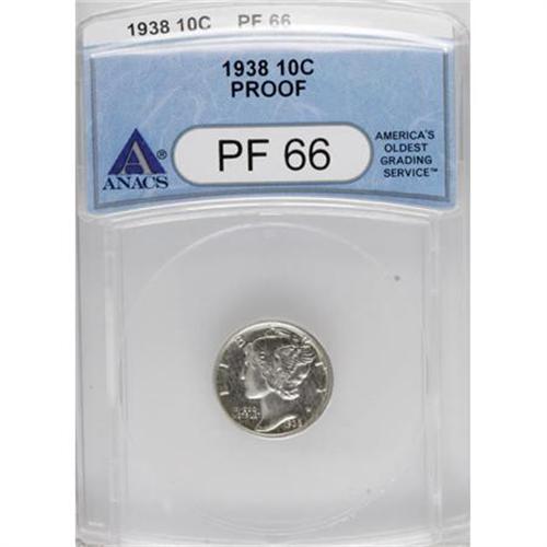 <B>1938 10C PR66 ANACS.</B></I> NGC Census: (560/210). PCGS Population (610/158). Mintage: 8,728. Numismedia Wsl. Price for NGC/PCGS coin in PR66: $460. (#5073)<BR><BR><B>Coin Engraver:</B> Adolph A. Weinman<BR><BR><b>Shipping:</b> Coins & Currency (<a target="_blank" href="http://www.heritageauctions.com/common/shipping.php">view shipping information</a>\)