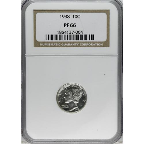 <B>1938 10C PR66 NGC.</B></I> NGC Census: (1114/416). PCGS Population (610/158). Mintage: 8,728. Numismedia Wsl. Price for NGC/PCGS coin in PR66: $520. (#5073)<BR><BR><b>Shipping:</b> Coins & Currency (<a target="_blank" href="http://www.heritageauctions.com/common/shipping.php">view shipping information</a>)