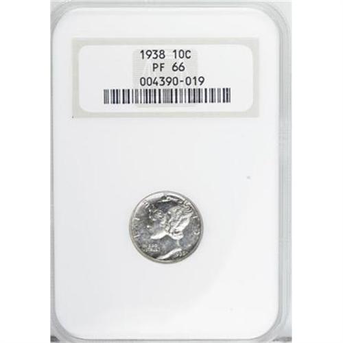 <B>1938 10C PR66 NGC.</B></I> NGC Census: (556/209). PCGS Population (610/158). Mintage: 8,728. Numismedia Wsl. Price for NGC/PCGS coin in PR66: $520. (#5073)<BR><BR><b>Shipping:</b> Coins & Currency (<a target="_blank" href="http://www.heritageauctions.com/common/shipping.php">view shipping information</a>)