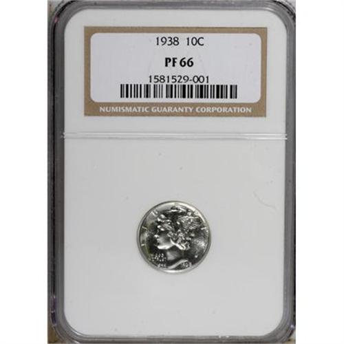 <B>1938 10C PR66 NGC.</B></I> NGC Census: (560/210). PCGS Population (610/158). Mintage: 8,728. Numismedia Wsl. Price for NGC/PCGS coin in PR66: $500. (#5073)<BR><BR><b>Shipping:</b> Coins & Currency (<a target="_blank" href="http://www.heritageauctions.com/common/shipping.php">view shipping information</a>)